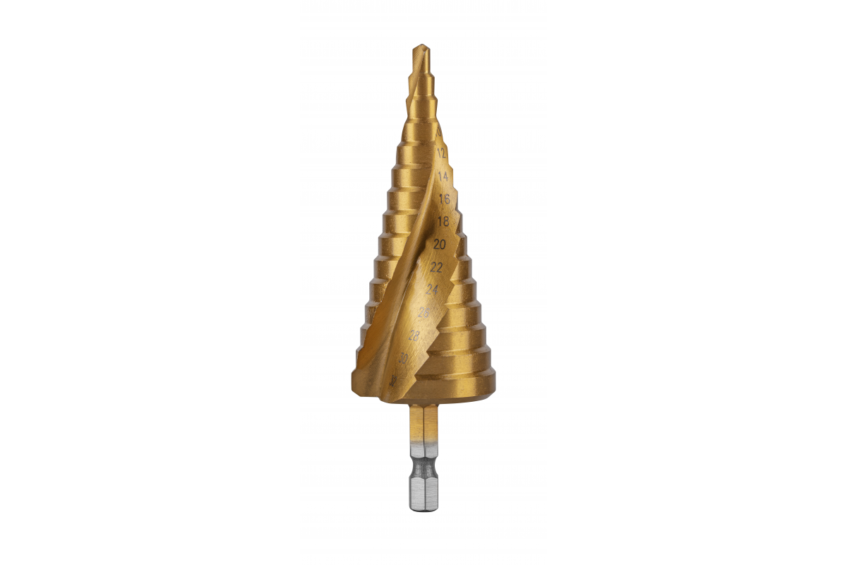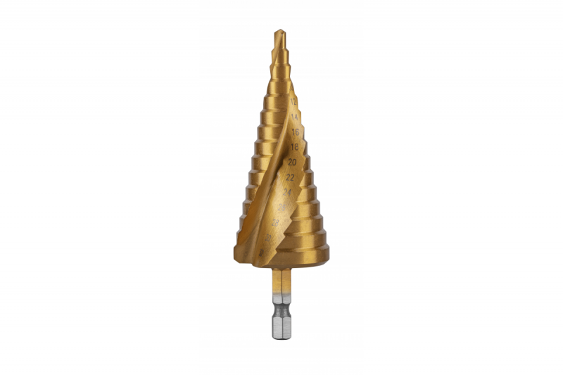 Gestufter Spiralbohrer zum Bohren in verschiedenen Stahlsorten, Nichteisenmetallen, Kunststoffen und Holz. Ermöglicht das Bohren von präzisen Löchern. Der Bohrer verfügt über spiralförmige Schneidnuten, die eine der effizientesten Technologien sind, die bei Stufenbohrern verwendet werden, und die ein viel schnelleres und effizienteres Bohren von Löchern ermöglichen, deren Kanten präzise entgratet bleiben. Er kann im Klempnergewerbe, in Karosseriewerkstätten oder bei Klempner- und Elektroarbeiten eingesetzt werden. Für den professionellen Einsatz.