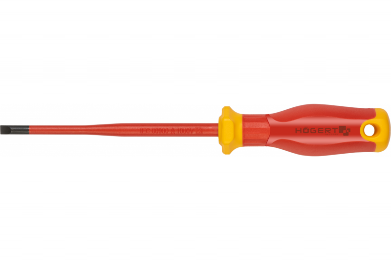 Flache Schraubendreher 1000 V, zertifiziert für die Arbeit unter Spannung. Die Schraubendreherbits sind beidseitig geschliffen, mit konvergierenden und parallelen Profilen. Der schmale Schaft ermöglicht das Arbeiten mit tieferen Schrauben und Gewinden.