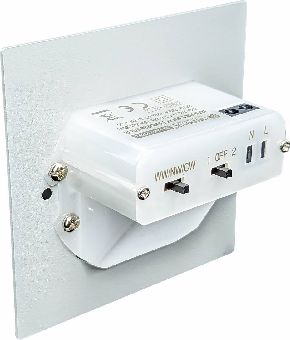 Schalter am Einbauteil der Leuchte ermöglichen die Einstellung der Lichttemperatur und die Bildung einer Gruppe von Leuchten, die gemeinsam geschaltet werden können.