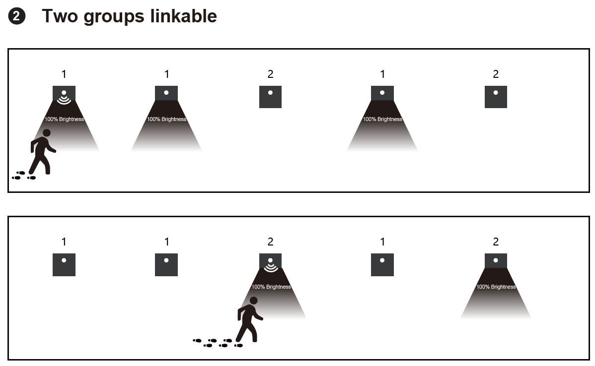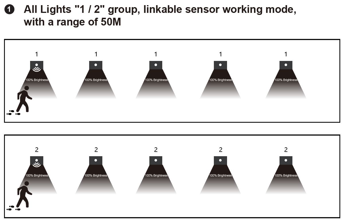 MODE 1 - Gruppenschaltung von Leuchten mit identischer Betriebsart (1). Die Leuchte, die eine Bewegung erkennt, schaltet sich ein und schaltet gleichzeitig alle Leuchten ein, für die wir die Betriebsart 1 eingestellt haben (sendet einen Funkimpuls an diese Leuchten)