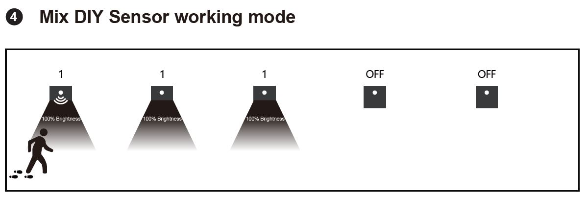 MODE OFF - die Leuchte arbeitet unabhängig und schaltet sich einzeln ein, wenn eine Bewegung erkannt wird.