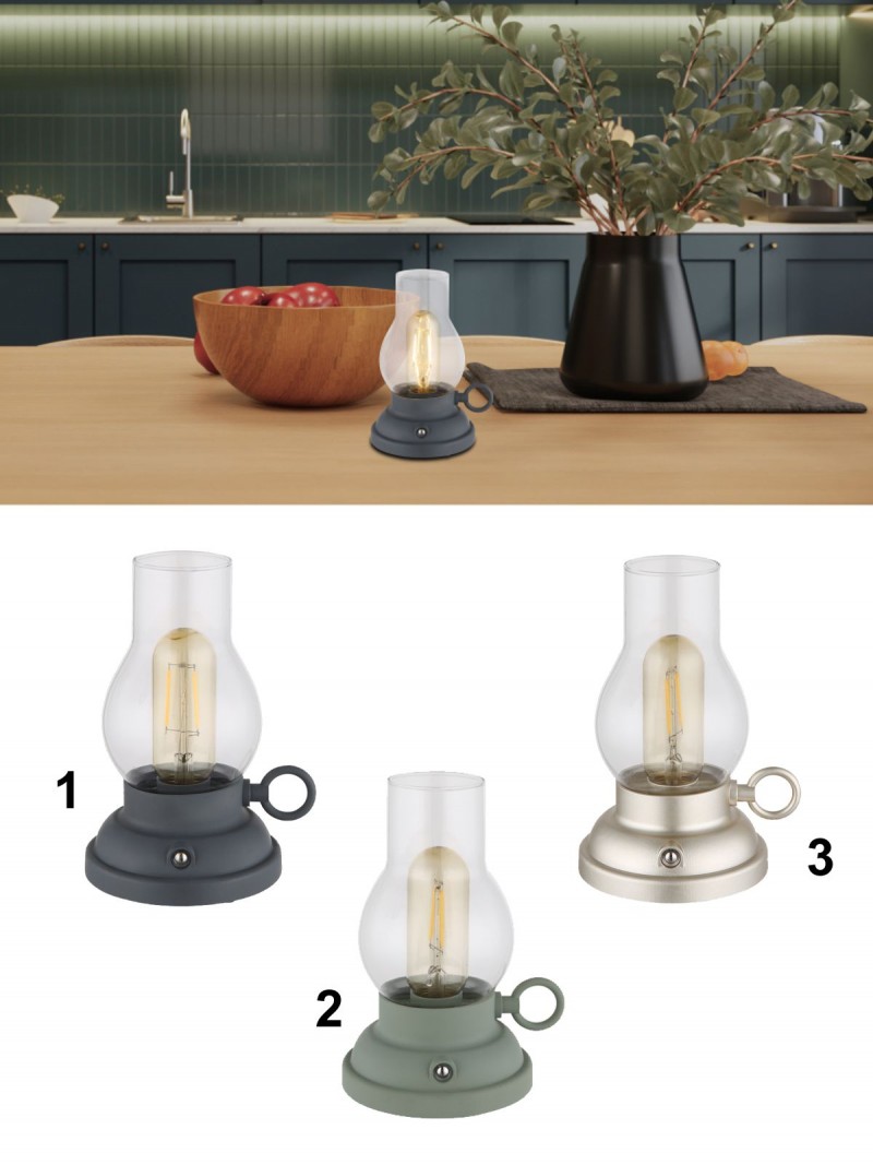 Dekorative Lampe aus Kunststoff mit Glasschirm. Die Lampe imitiert eine altmodische Petroleumlampe. Sie verfügt über einen Touch-Schalter. Ein Ladekabel ist im Lieferumfang enthalten. Die Lampe leuchtet auch während des Ladevorgangs. Sie leuchtet mit warmweißem Licht, was einen sehr angenehmen Eindruck macht.