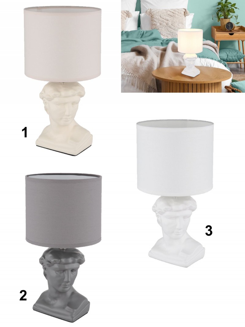 Schlichte, elegante Tischleuchten, geeignet für Wohnzimmer, Schlafzimmer, Flure etc. Der Sockel hat die Form einer Caesar-Büste und besteht aus Keramik, der Schirm ist rund und aus Textil. Mit E14-Fassung. Die Leuchten werden ohne Leuchtmittel geliefert. Kabellänge 130 cm. |