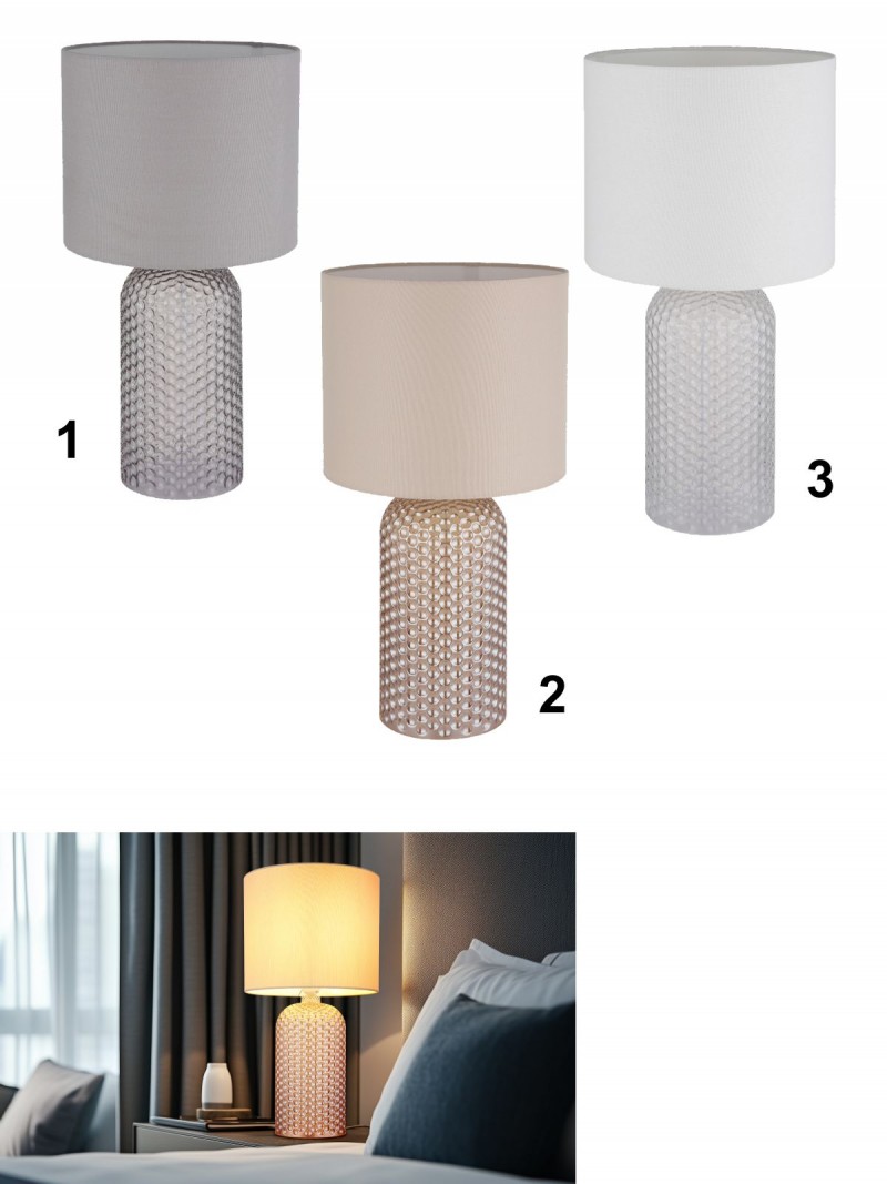 Stilvolle Tischleuchte aus Glas mit Textilschirm. Der Glasfuß der Leuchte ist verziert, was ihr ein interessantes Aussehen verleiht. Sie eignet sich perfekt für Wohnzimmer, Schlafzimmer und Flure, um eine angenehme Atmosphäre zu schaffen. Mit E27-Fassung. Leuchtmittel sind nicht im Lieferumfang enthalten. Kabellänge 130 cm.
