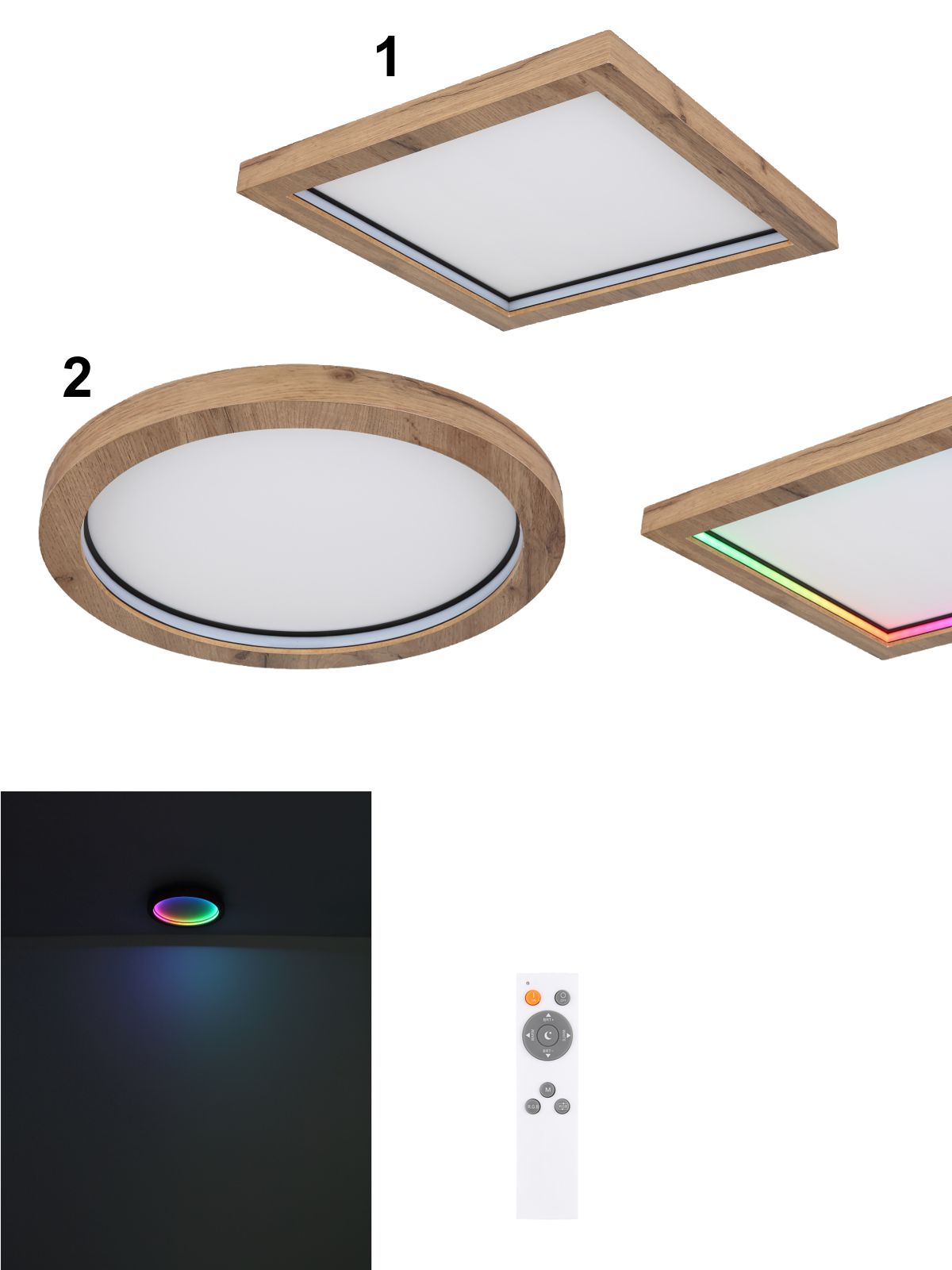 Moderne Deckenleuchten aus Metall in mattschwarzer Farbe, MDF in dunkler Holzimitation und Kunststoff in Opalfarbe. Die Lampen lassen sich mit einer Fernbedienung steuern, die über viele Funktionen verfügt – z.B. Dimmen, RGB-Farbwechsel, Farbfixierung, Nachtlicht, Memory-Funktion der letzten Einstellung und auch einen Regenbogeneffekt. Die Lampen eignen sich nicht nur für das Wohn- und Schlafzimmer, sondern auch für das Kinderzimmer, wo Kinder jede Farbe wählen können, die ihnen gefällt. |