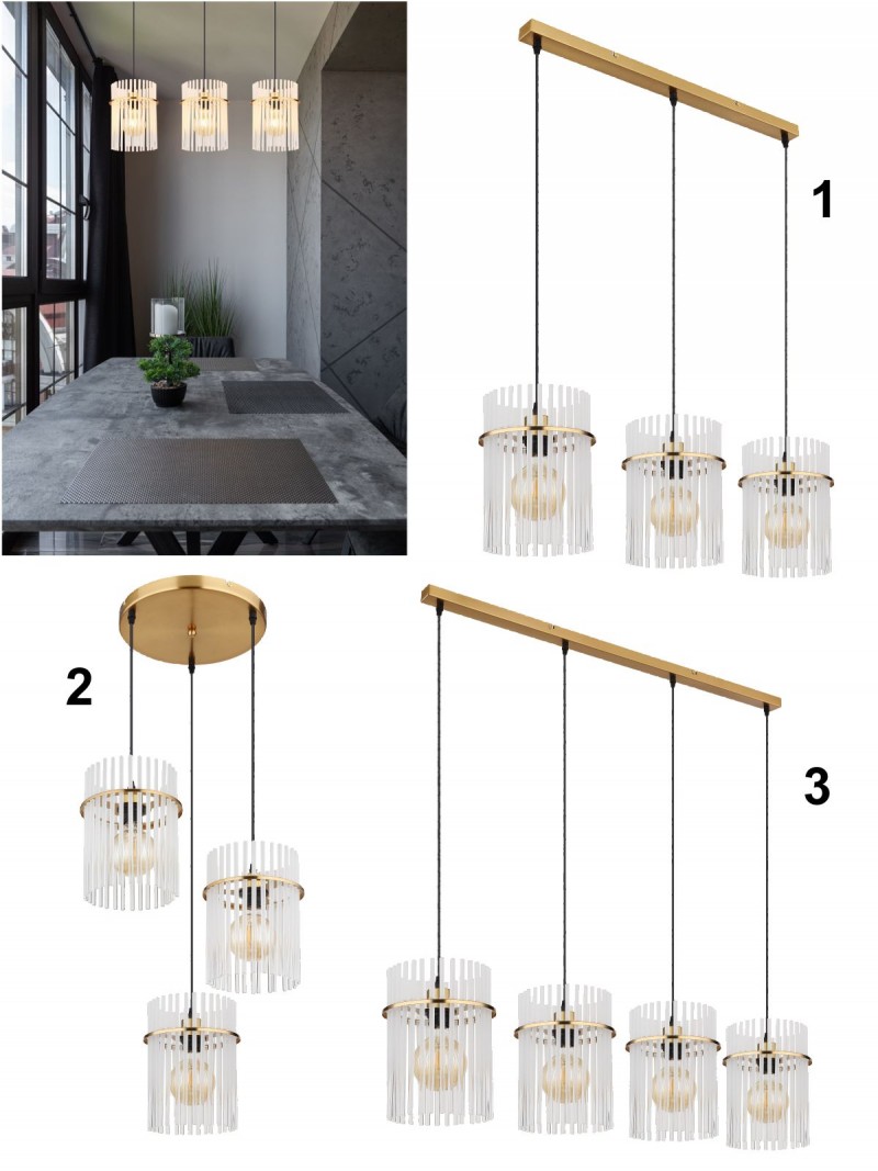 1. GL-15698-3HM  Závěsné svítidlo, kov zlaté barvy, skleněné tyče bílé, průhledné, kabel PVC černý, možnost zkrácení výšky, Dx?xV:800x200x1400mm, bez žárovek 3xE27, Max. 60W 230V detail výrobku