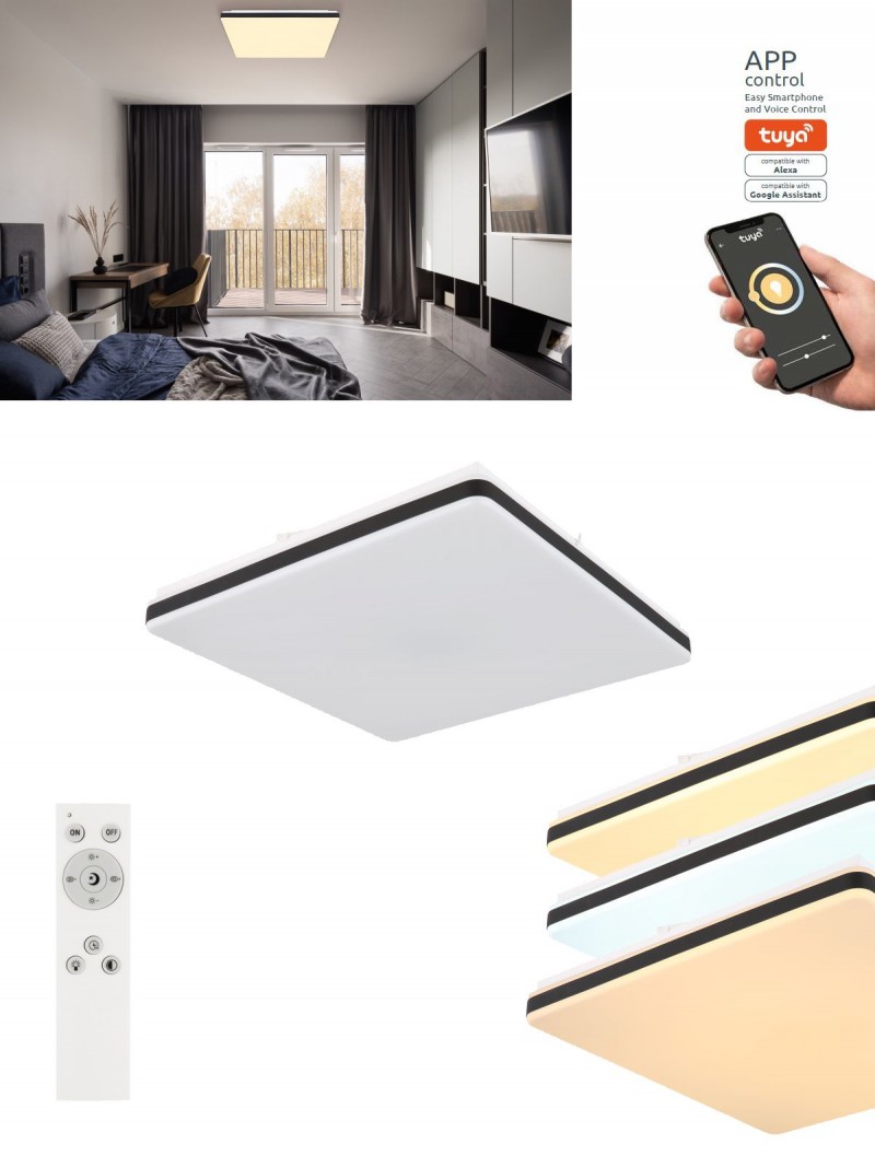 1. GL-48025OBSH Stropní svítidlo, kov bílý, plast černý, akryl opál, stmívatelné, fixace barev, SmartLight, pam. funkce, noční světlo, časovač, dál. ovládání, Dx?xV:485x485x66mm, LED 24W 230V, Výstup 100-1400lm, změna barvy světla 2700-6500K detail výrobku