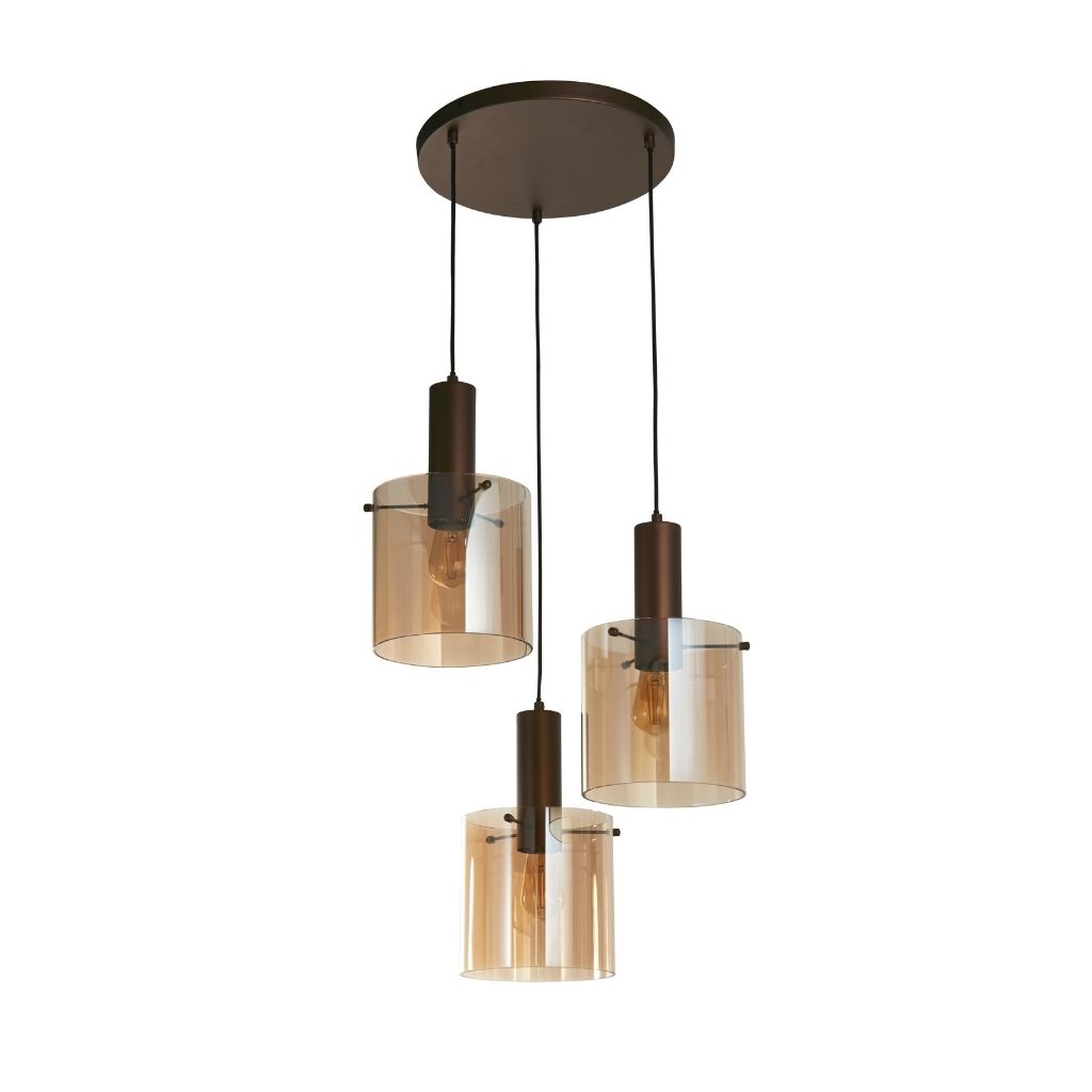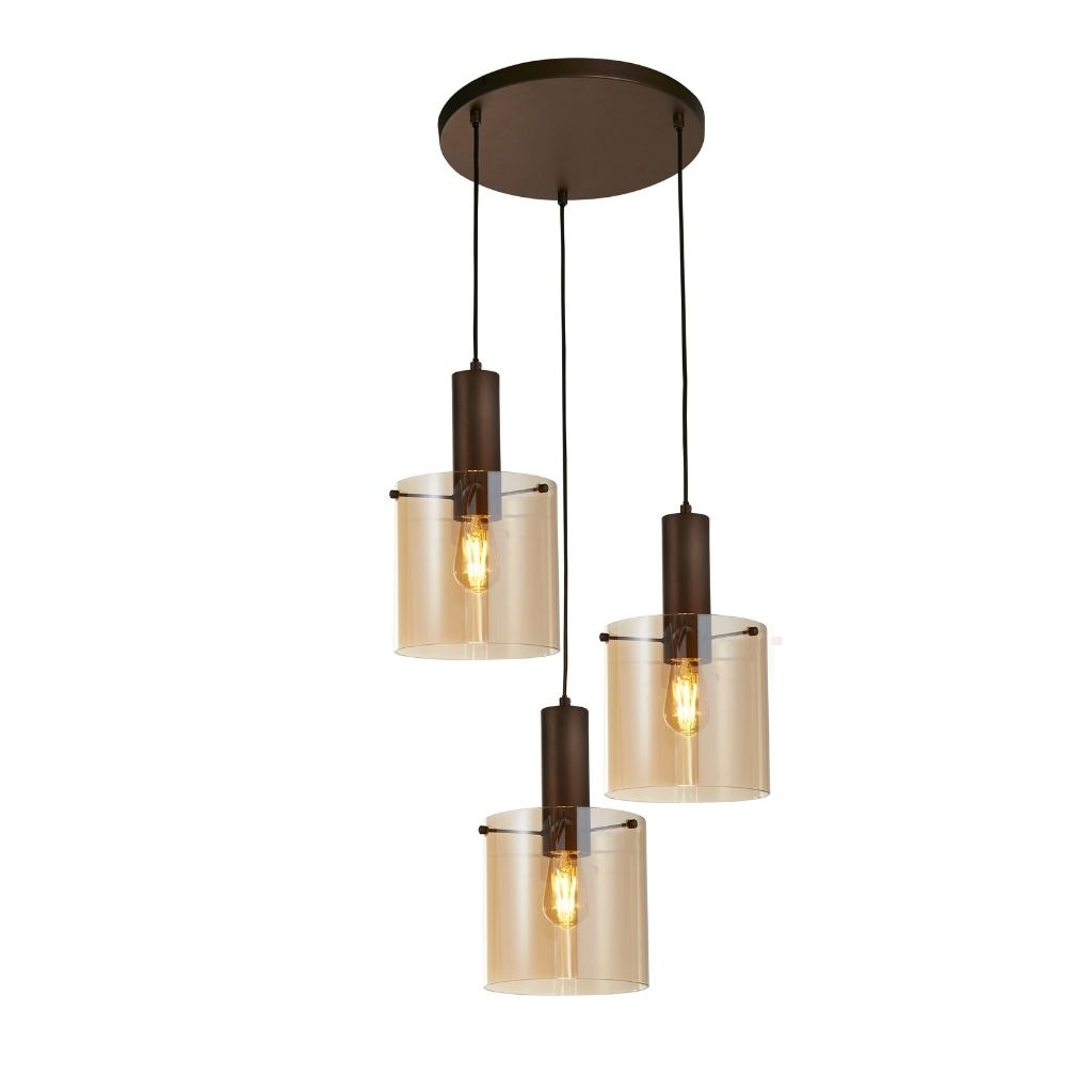 Searchlight Pendelleuchte kaffeefarben, Oberfläche mattiert, verwendetes Material ist Baustahl und Glas. Maße in cm: Gesamthöhe: 150, Höhe: 35, Breite: 47, Länge: 47, Ausladung: 0. Lichtquelle E27-Fassung, 3 Glühbirnen benötigt, Lichtquelle nicht enthalten, Hersteller empfohlen Glühbirne Typ ist klassische Glühbirne für max 60W. |