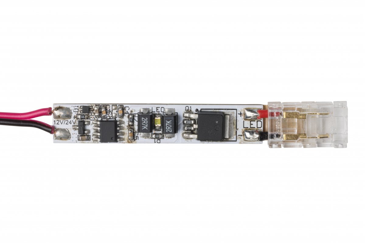 Bezkontaktní spínač pro montáž do profilu, z jedné strany je zakončen COB konektorem, který umožňuje rychlou montáž COB pásky na spínač, a z druhé 2m dlouhým mini amp kabelem. Disponuje funkcí stmívání. Připravenost k provozu je indikována diodou. Usnadňuje také nalezení vypínače v noci. Nepřipojujte živý spínač. První spuštění by mělo proběhnout s nasazeným krytem.