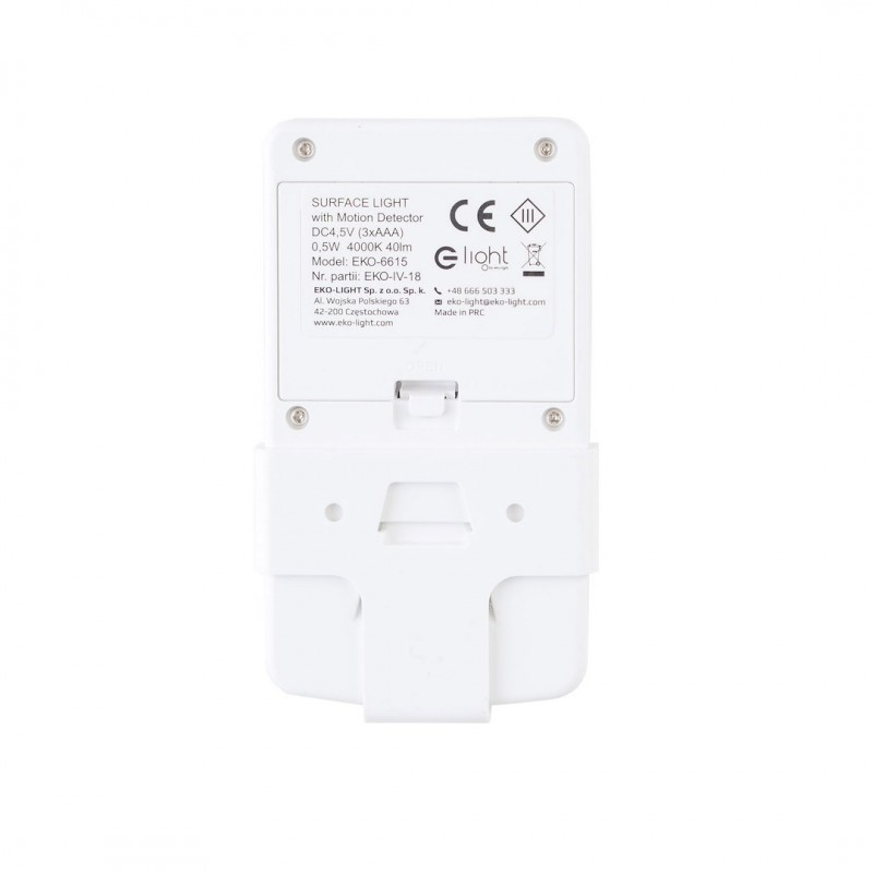 Povrchové svítidlo se senzorem pohybu od společnosti Eko-light je vyrobeno z PVC materiálu v univerzální bílé barvě. Tento model je vybaven přídavným bočním zdrojem světla. Zařízení má barevnou teplotu 4000 K, což znamená, že poskytuje světlo neutrální barvy. Příkon, při kterém pracuje, se rovná 0,5 W, přičemž světelný výkon je 40 Im . Důležitý je také stupeň krytí tohoto modelu, který je IP 20, což znamená ochranu proti jakémukoli pylu. Lampa má následující rozměry: šířka 125 mm, hloubka 35 mm a výška 65 mm. Váží 0, 10 kg a byla navržena pro povrchovou montáž. Tento model je vybaven světlem LED, které je energeticky úsporné a odolné. Svítidlo je napájeno bateriemi. Je ideální do tmavých místností, kde nelze použít síťové osvětlení. |