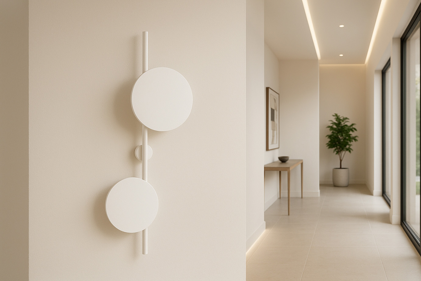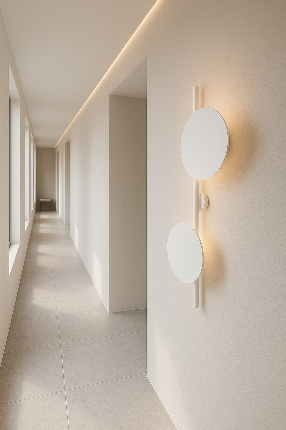 Použití asymetrie dodává svítidlům PERO moderní nádech. Na rovné trubici jsou připevněny dva bílé disky různých průměrů, které vytvářejí nejen světelný zdroj, ale také jedinečnou dekoraci. Oboustranné světlo jemně vykukuje zpoza kovových disků a dodává interiéru stylový nádech. Svítidlo můžete namontovat jak vertikálně, tak horizontálně. Můžete také kombinovat různé modely z řady PERO a vytvořit tak jedinečné uspořádání na celé stěně.