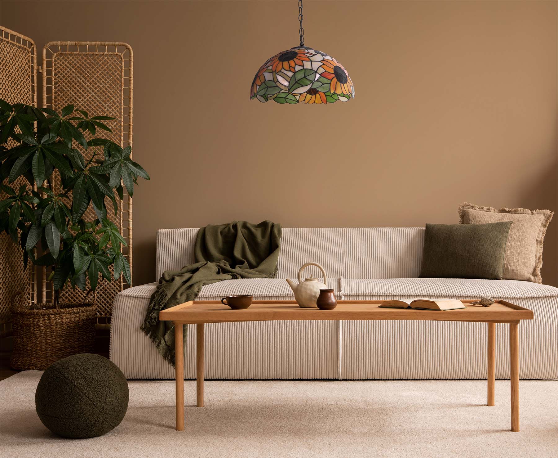 Hledáte osvětlení, které váš interiér nejen rozzáří, ale také mu vdechne život a osobitost? Odpovědí je závěsné svítidlo K-P16814 z řady SUNFLOWER - ideální pro ty, kteří chtějí rozbít chlad moderního prostředí a vytvořit prostor, ve kterém se vám bude opravdu chtít být. Její ručně vyráběné vitrážové stínidlo, zdobené motivem slunečních květin v intenzivních odstínech oranžové a zelené, působí jako protilátka proti každodenní šedi - do každého interiéru vnese teplo, optimismus a nádech uměleckého ducha.