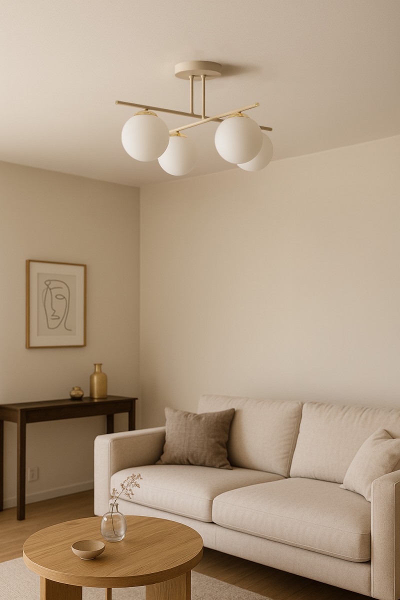 Svítidlo K-5793 z řady SAVIA je dokonalým řešením, které splňuje potřeby těch, kteří hledají moderní, stylové a energeticky úsporné osvětlení. Její béžová kovová armatura s práškovým nástřikem v kombinaci s bílými skleněnými stínidly ve tvaru koule se zlatými detaily činí z této lampy ústřední bod každého interiéru. Díky svému jednoduchému, ale elegantnímu designu se lampa K-5793 dokonale hodí do různých stylů, od moderního po glamour, a vnese do místnosti jedinečnou atmosféru.