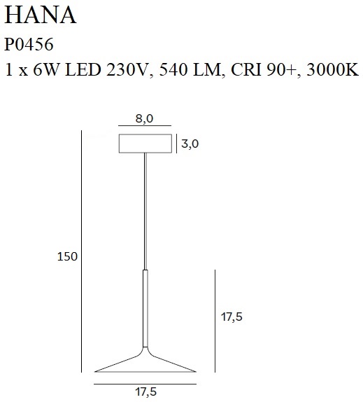 Příkon: 1 x 6W LED 230V, 540 LM, CRI 90+, 3000K . V: 150 cm, Ø 17,5 cm Povrchová úprava/detaily: černá/černá Materiál/Materiál: hliník, akryl Hliník, akryl Včetně LED diody / LED dioda je součástí dodávky 3000K |