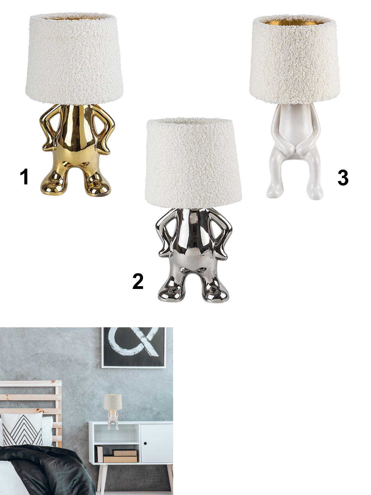 Stilvolle Lampen aus Keramik und Textil. Der Keramiksockel ist im Stil einer Figur gestaltet, der Schirm ist aus Schaffellimitat. Passt perfekt in moderne Innenräume sowie in Kinder- oder Studentenzimmer. |