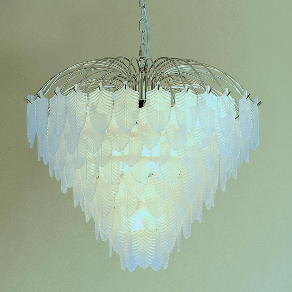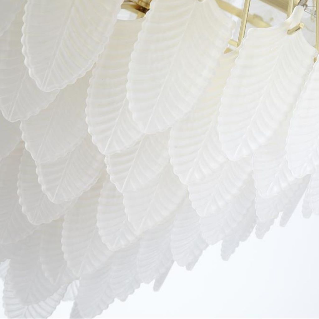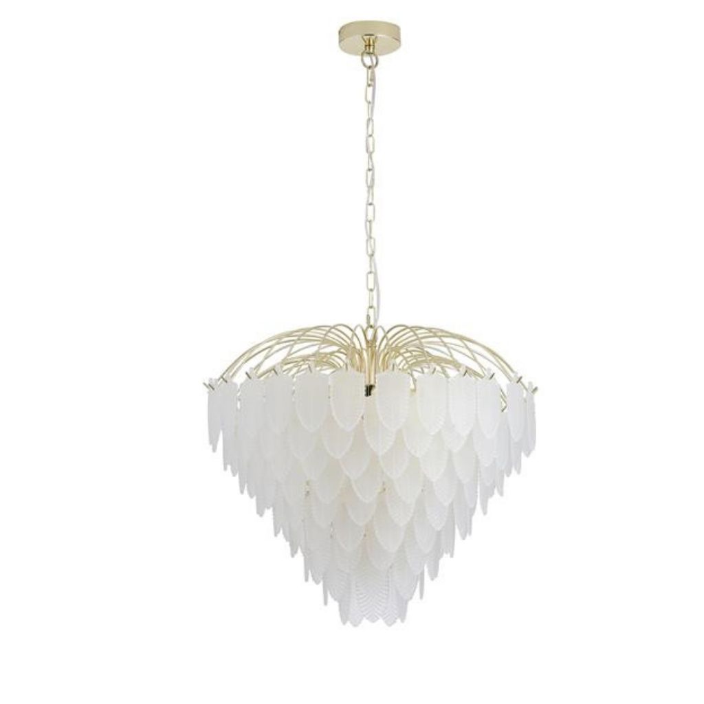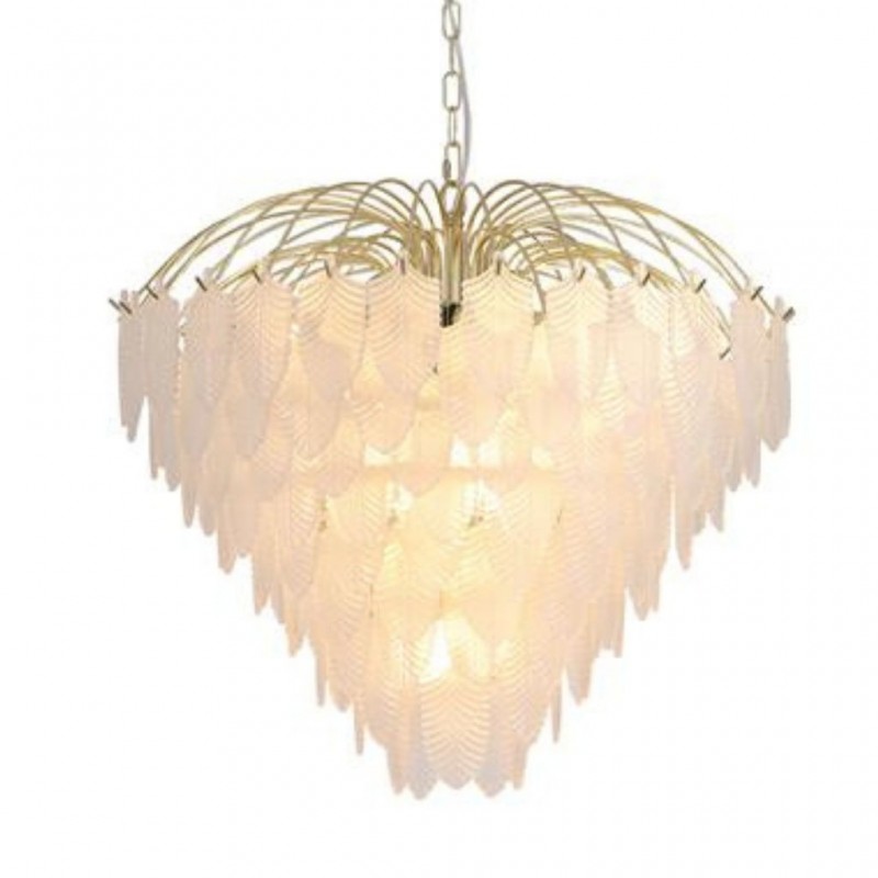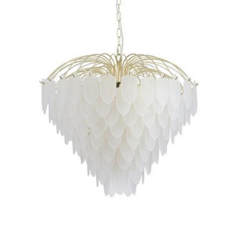 Feather závěsné svítidlo je v luxusním stylu, vyrobené z kovu s povrchovým zpracováním matné mosazi a se skleněnými lístky jako stínidlo.