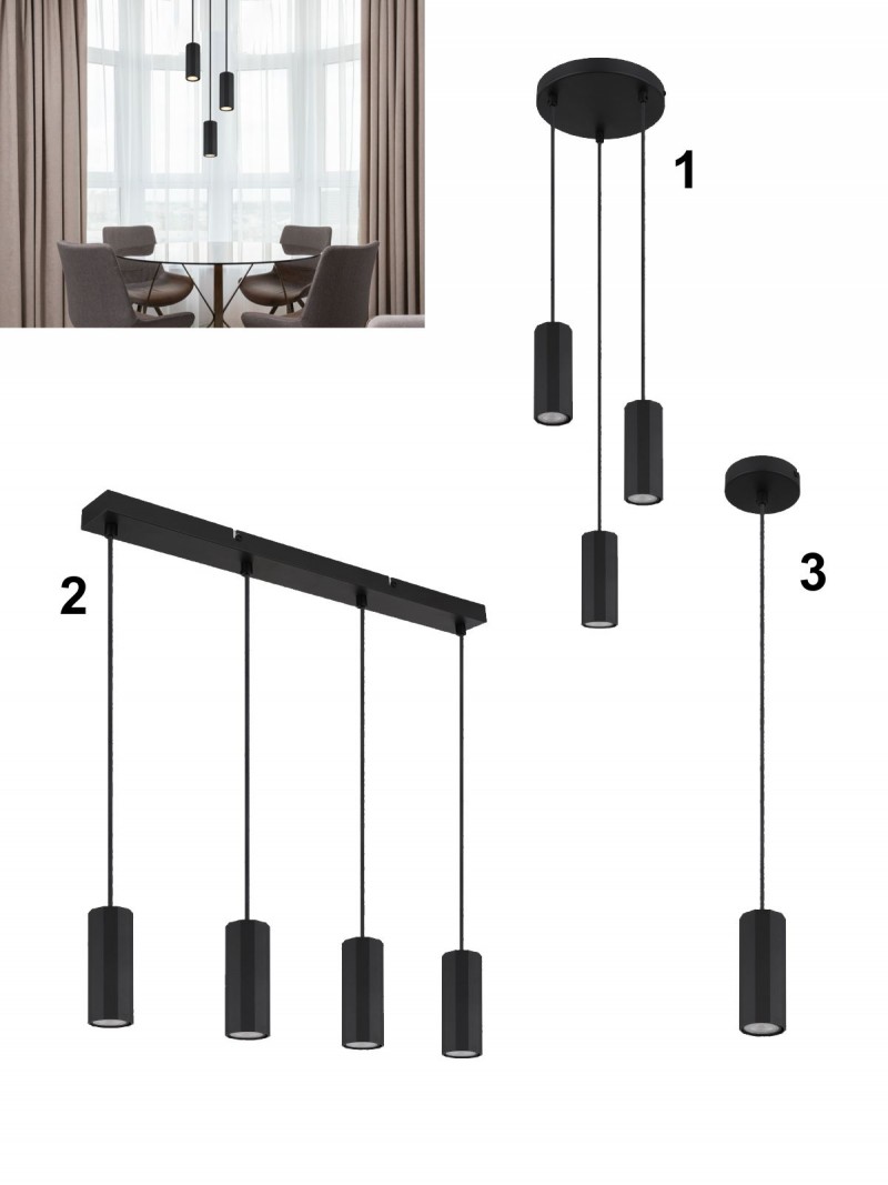Stilvolle Pendelleuchten aus Metall und Aluminium in Mattschwarz. Der Leuchtenkörper besteht aus Metall und der Schirm aus Aluminium. Mit GU10-Fassung. Diese modernen Leuchten lassen sich mit einem smarten LED-Leuchtmittel ergänzen und per Smartphone die Farbe oder Temperatur des Lichts verändern, dimmen und so eine angenehme Atmosphäre im Innenraum schaffen.