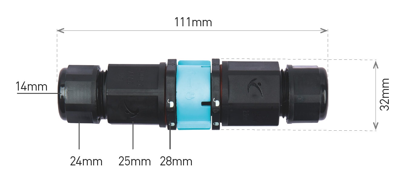 Propojovací příslušenství Pro rychlé bezšroubové zapojení. Snadné rozpojení konektoru. Systém zásuvky a zástrčky se zajištěním otočným zámkem. Materiál: polyamid PA66 IP68 kabelová vodotěsná spojka. Vhodné pro venkovní použití, například pro připojení LED reflektorů, street light a highbay svítidel. Pro vodiče o průřezu 0,75-2,5mm2 (délka odizolování 10mm) Maximální průřez vodičů 2,5 mm2 (délka odizolování 16mm) Počet vodičů: 3 Průměr kabelu: 6/7 - 11/12 mm Maximální U/I: 250V/16A Určeno k povrchové instalaci. Bez pevnostní fixace kabelu v tahu. DOSTUPNÉ POUZE V BALENÍ PO 10KS. |