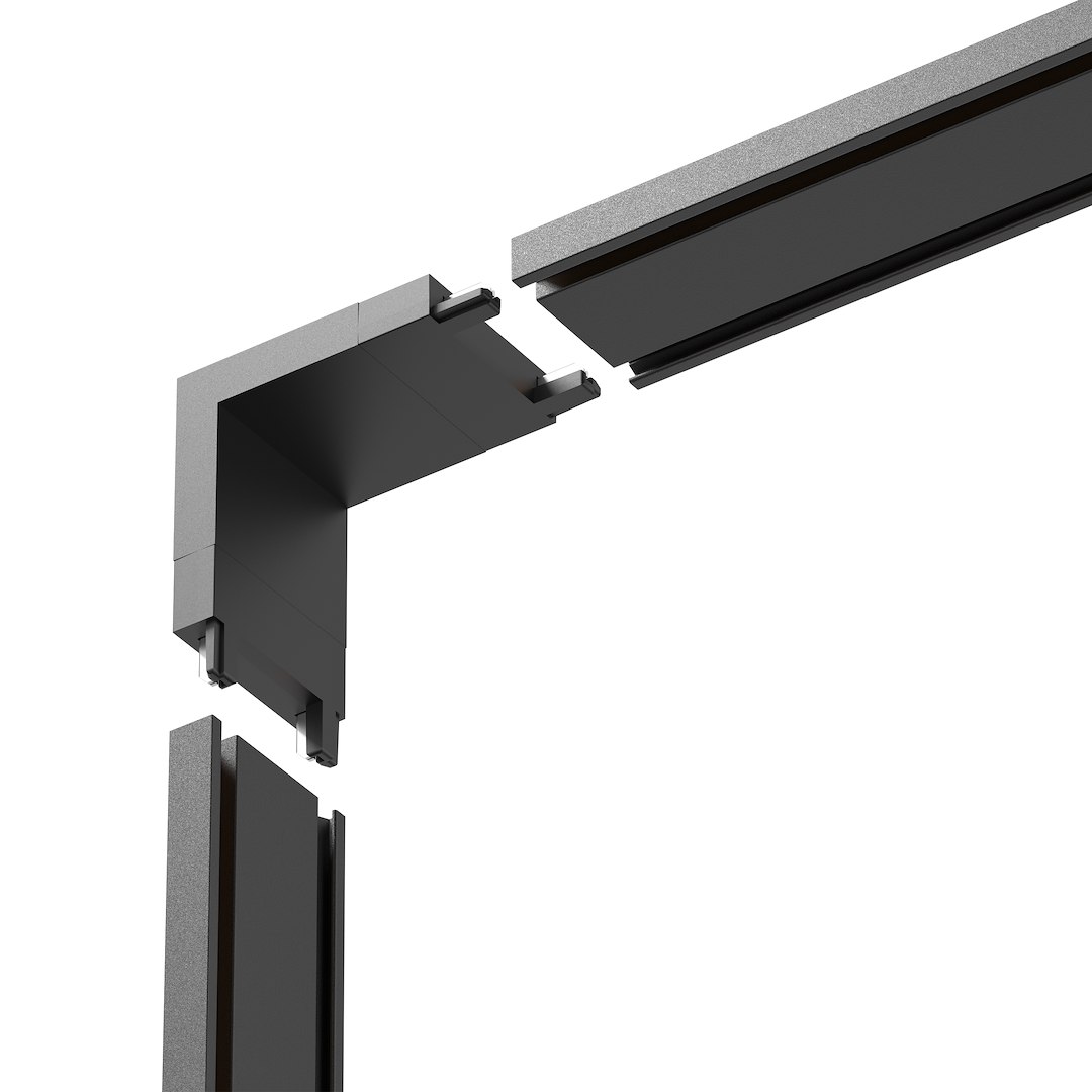 Černý roh ve tvaru písmene L je součástí, která umožňuje estetické a funkční vedení magnetické dráhy Slim do rohů místností. Díky preciznímu provedení a kompatibilitě s celou řadou zachovává kontinuitu napájení a stabilitu instalace. Toto řešení je ideální pro výstavní prostory, kanceláře nebo showroomy, kde je vyžadováno flexibilní přizpůsobení osvětlení architektonickému uspořádání.