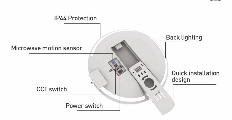 Při instalaci je možnost pomocí přepínačů integrovaných na zadní straně svítidla změnit teplotu chromatičnosti ve třech stupních (3000/4000/6000 K), výkon svítidla ve čtyřech stupních (24/18/12/6 W) a parametry senzoru.