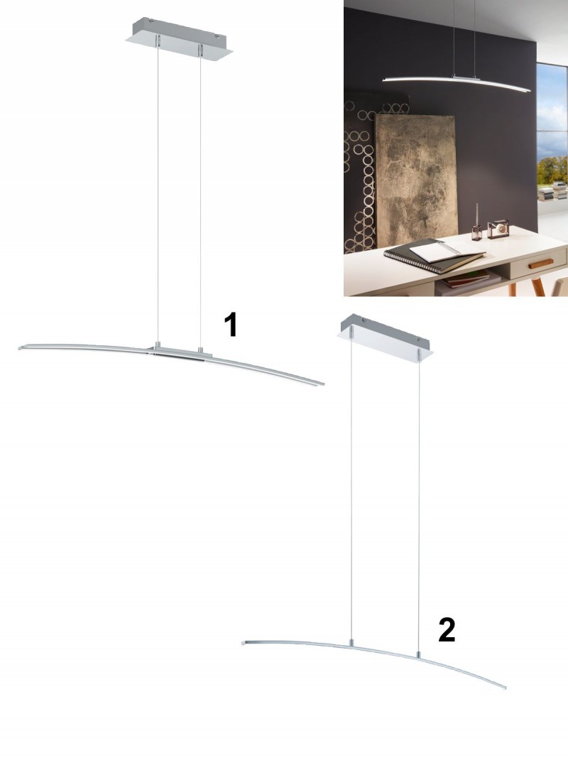 Eine moderne LED-Pendelleuchte passend für die Küche über der Kücheninsel, im Esszimmer über dem Esstisch, aber auch in Werkstätten und Büros. Es besteht aus Aluminium und Stahl in der Farbe Chrom und Kunststoff in der Farbe Weiß. Sie strahlen in einem warmweißen Farbton und sind nicht dimmbar. |
