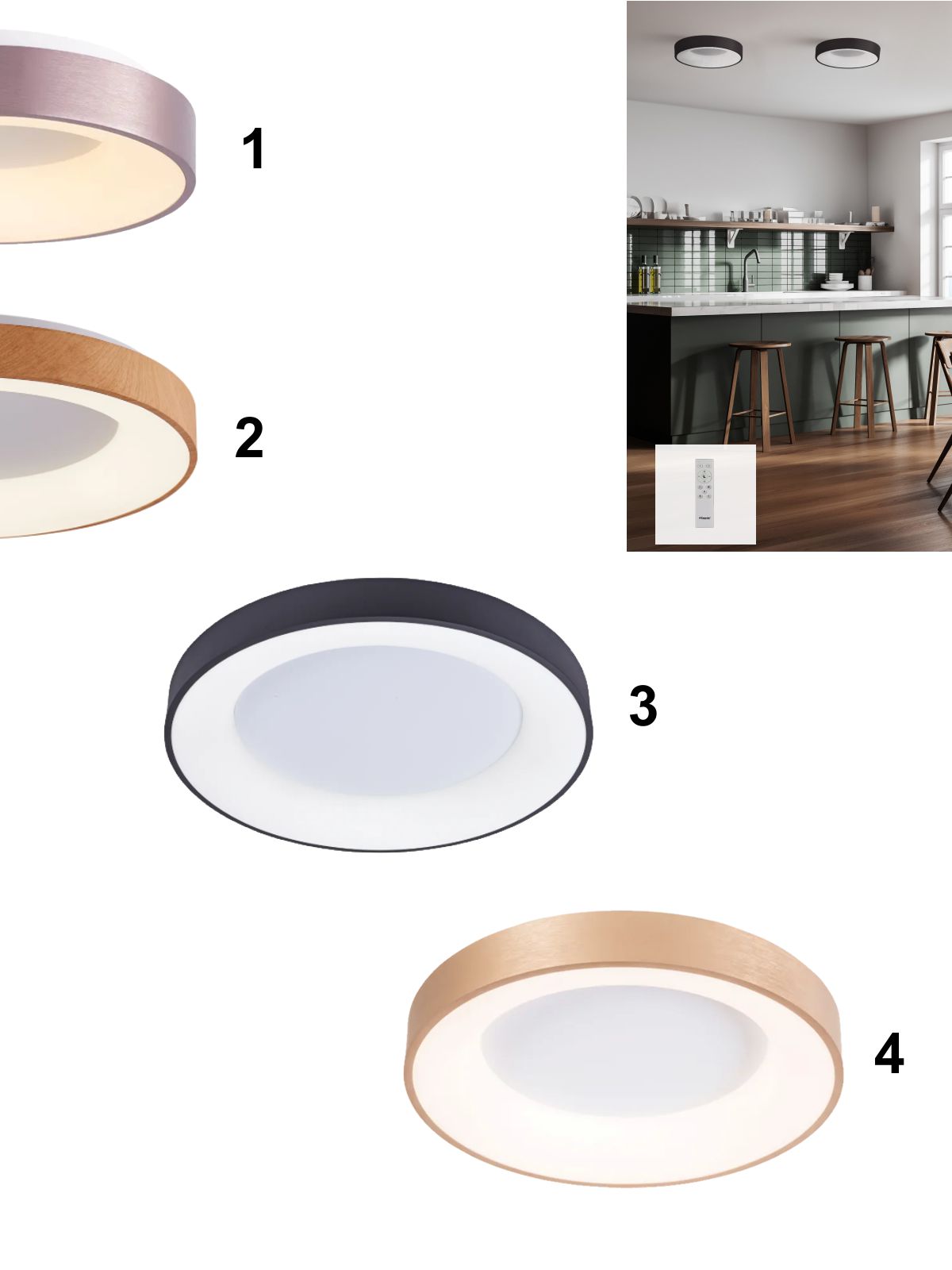 Die Santana LED DIMM 2 Deckenleuchten bestehen aus Aluminium und einem Kunststoffschirm. Sie eignen sich perfekt für moderne Interieurs. Die mitgelieferte Fernbedienung ermöglicht das Dimmen des Lichts und die Einstellung der Farbtemperatur zwischen 3000 K und 6500 K. Die LED-Lichtquelle ist fest verbaut und nicht austauschbar.