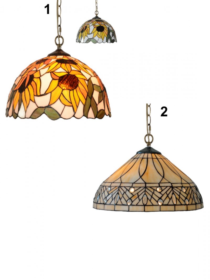 Die Kronleuchter Tiffany XXIV und Tiffany XXIII passen hervorragend zur Tiffany-Lampenfamilie. Die Lampen sind aus Metall und verziertem Glas gefertigt und verfügen über ein E27-Gewinde. Die Leuchte wird ohne Leuchtmittel geliefert. Dieses muss separat erworben werden.