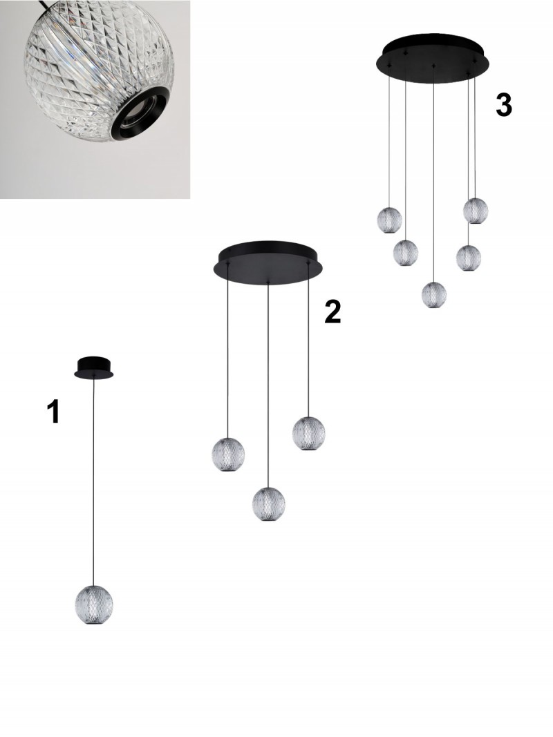 Elegante LED-Hängeleuchte aus schwarzem Metall mit Acrylschirm in Kristalloptik. Die LED-Lichtquelle ist fest verbaut und nicht austauschbar. Sie leuchtet warmweiß. |