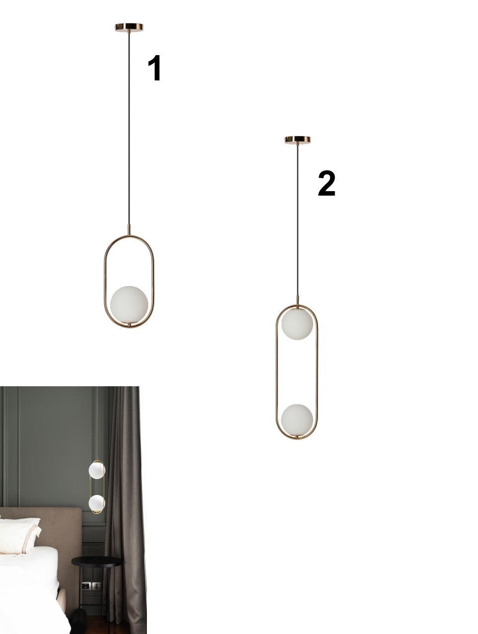 Interessante Kronleuchter aus goldfarbenem Aluminium mit weißen, kugelförmigen Glasschirmen. Mit G9-Fassung. Die Lampen werden ohne Leuchtmittel geliefert.