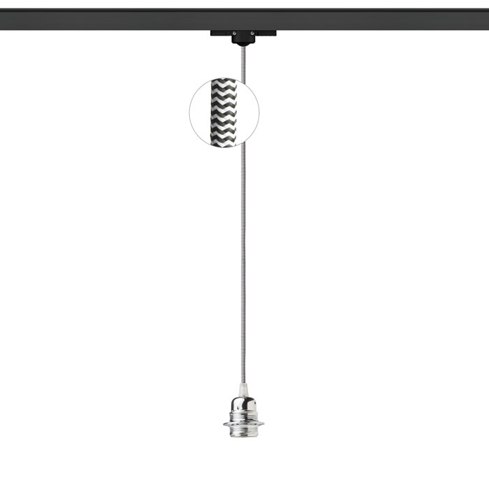 Textilkabel mit Metallhülse in verschiedenen Farbkombinationen, endend mit einem Adapter zum Einhängen in eine Dreiringleiste. |