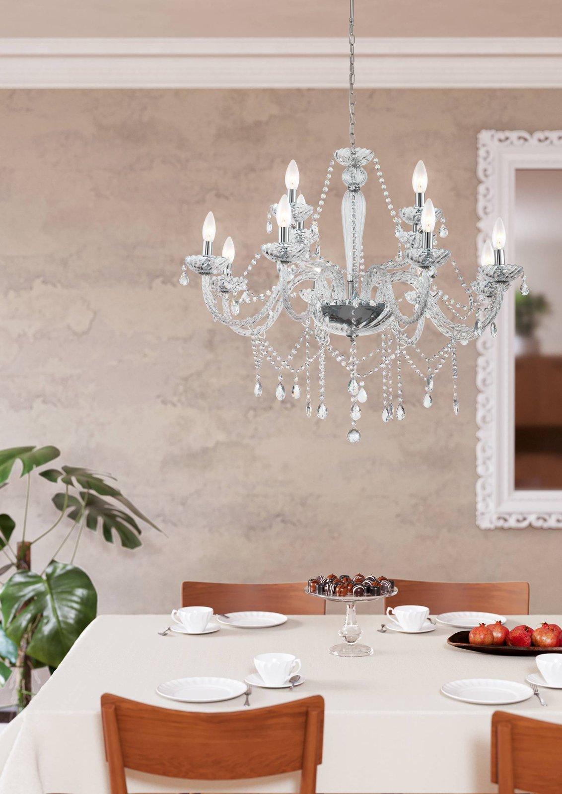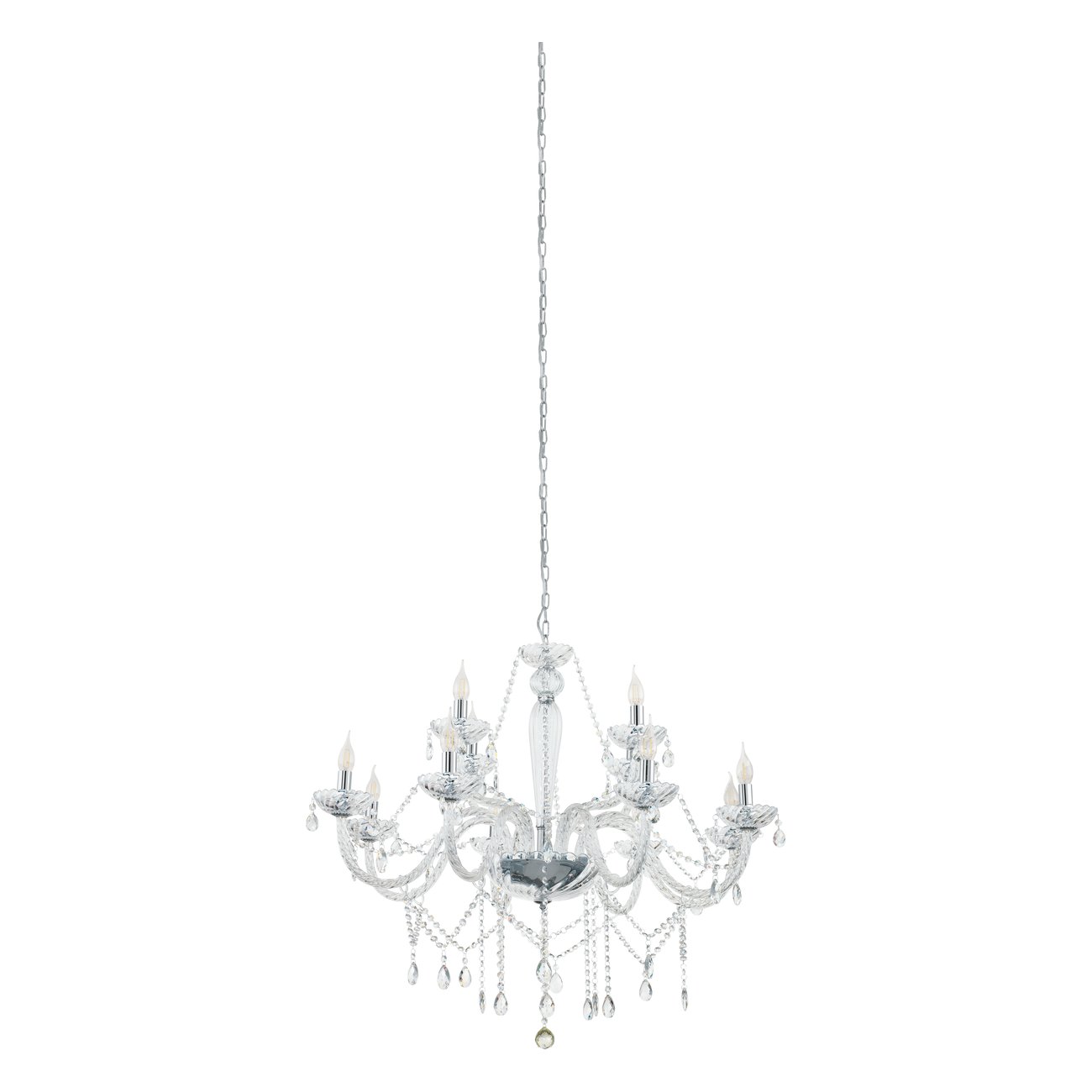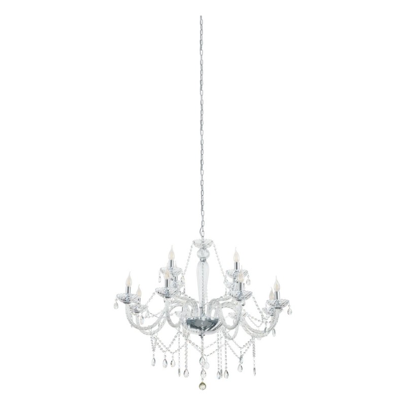 Basilano sind Kronleuchter im klassischen Stil. Sie bestehen aus chromfarbenem Stahl und klarem Glas. |