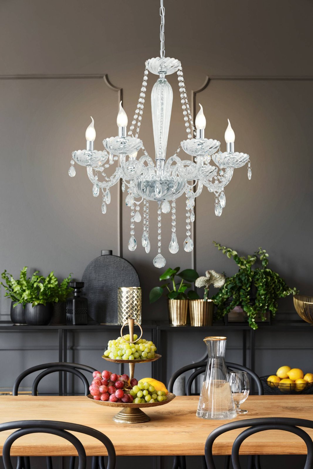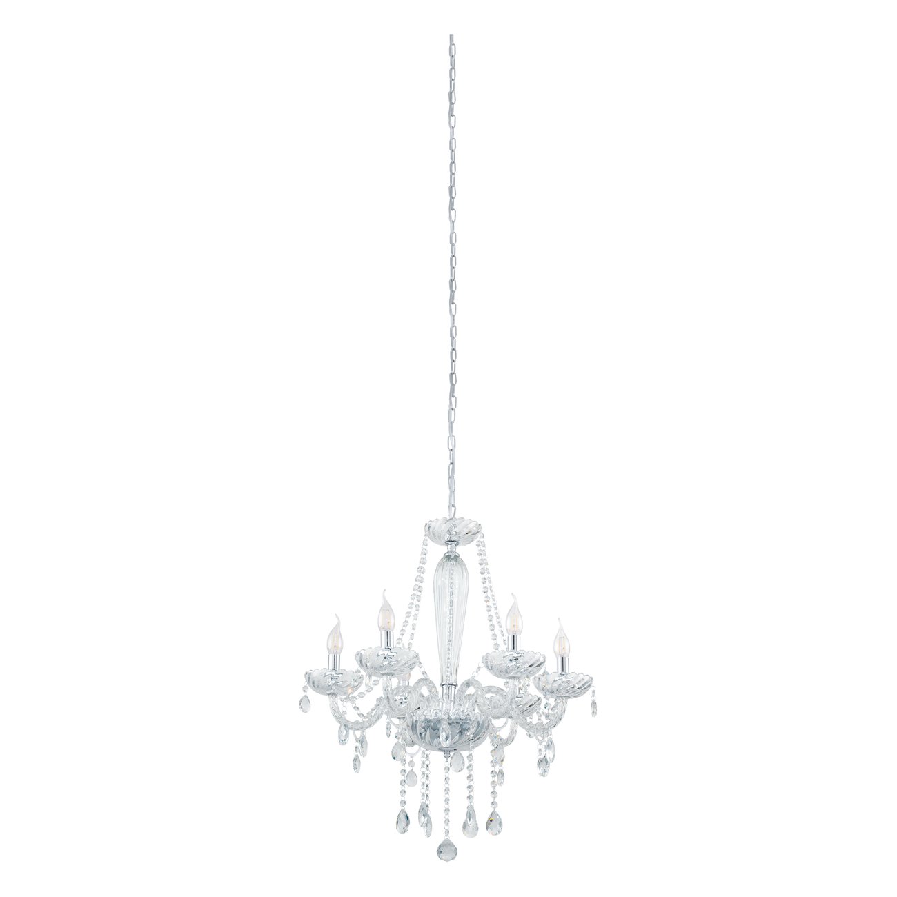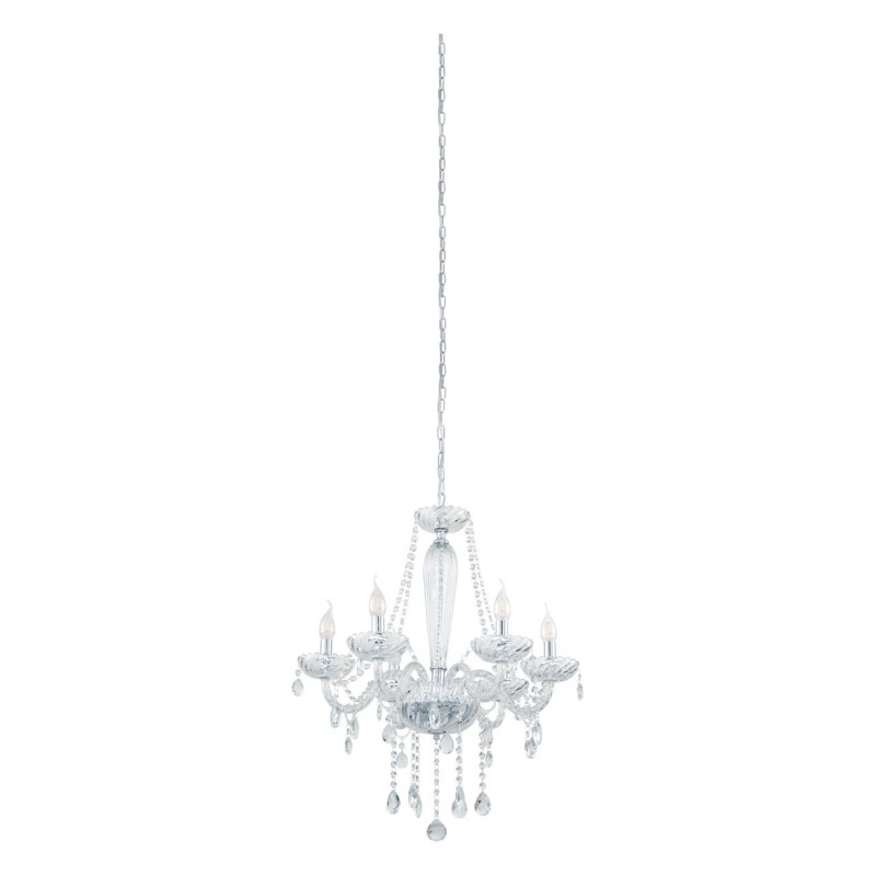 Basilano sind Kronleuchter im klassischen Stil. Sie bestehen aus chromfarbenem Stahl und klarem Glas. |