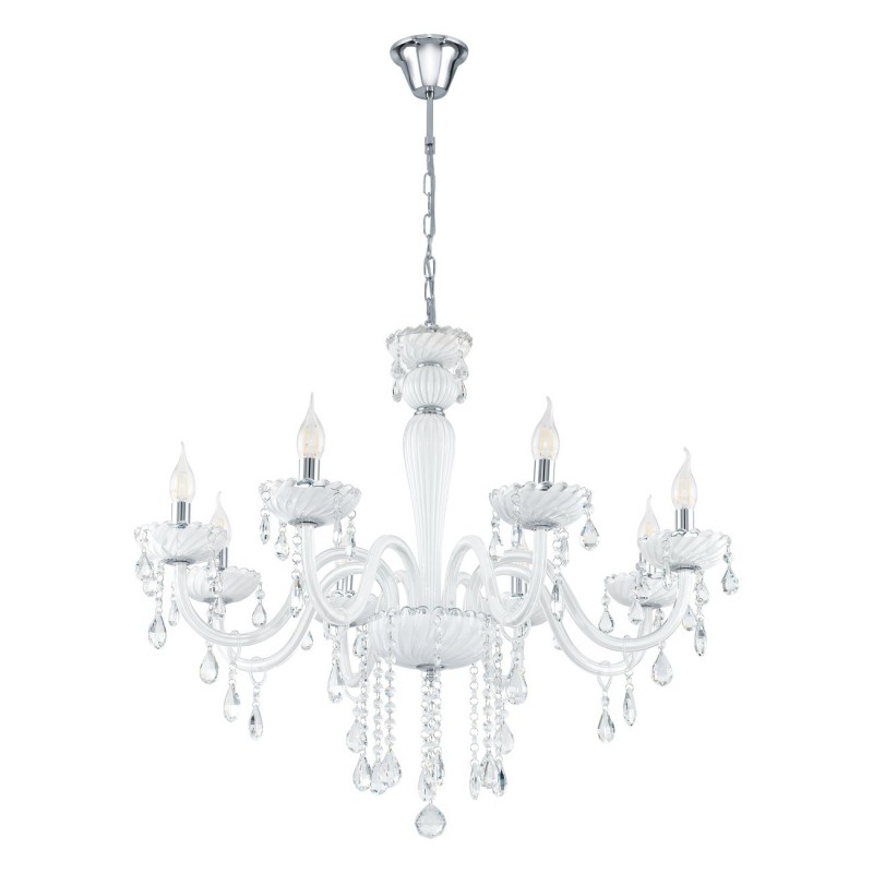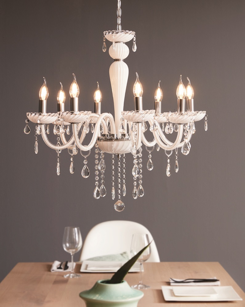 Carpento sind Kronleuchter im klassischen Stil. Sie bestehen aus chromfarbenem Stahl und weißem Glas. |