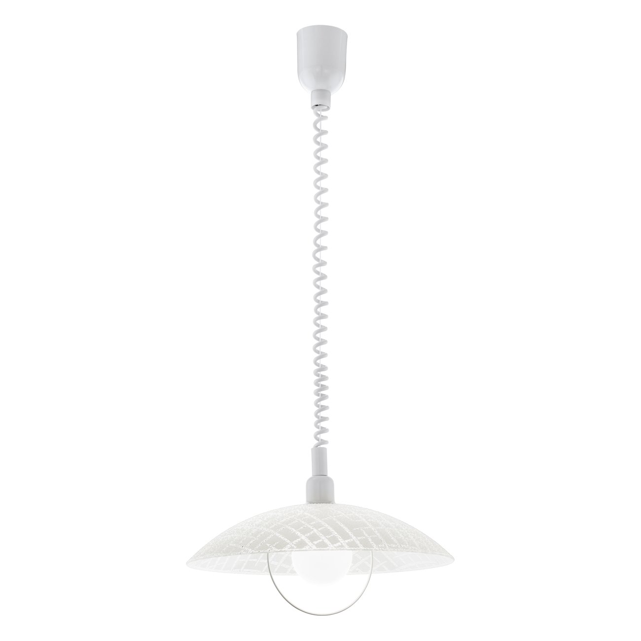 Die runde Hängelampe Alvez ist im klassischen Stil aus Kunststoff in weißer Farbe und strukturiertem Glas mit Dekor gefertigt. Es eignet sich für klassische Küchen und Esszimmer.