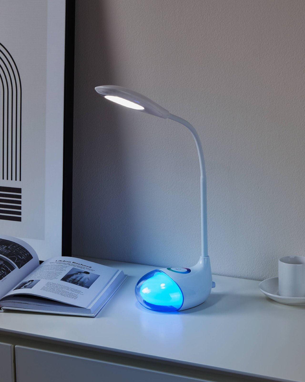 Eine interessante Tischleuchte, geeignet für Büros, Werkstätten oder Kinder- oder Studentenzimmer. Es besteht aus weißem Kunststoff. Es ist möglich, es zu dimmen und die RGB-Farben zu ändern.