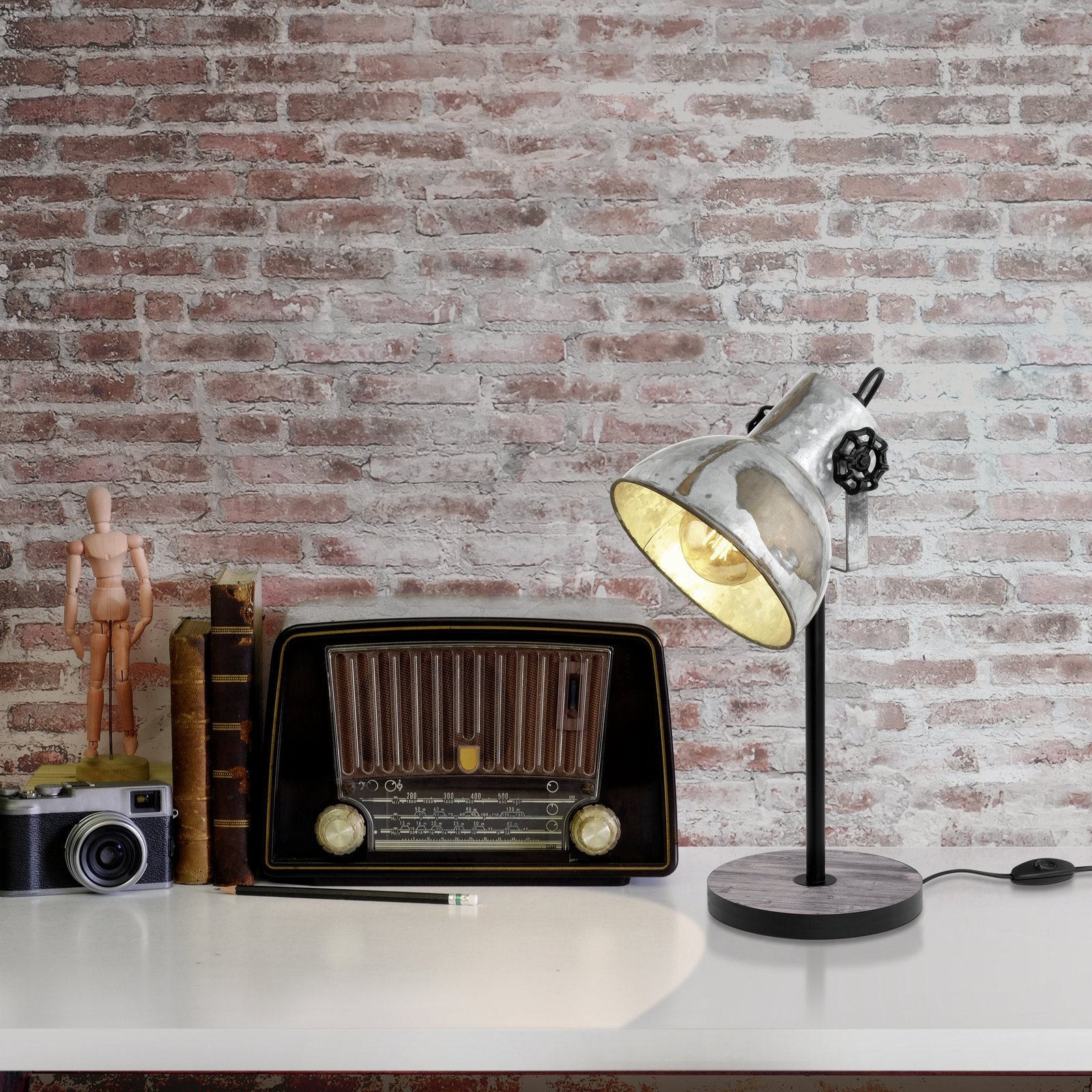 Interessante Strahler aus Stahl und Holz. Die Lampen haben einen sehr ausgeprägten, industriellen Charakter. Der Sockel hat eine braune Farbe und die Lampenschirme sind im Patina-Look von rostigem Zink gehalten. |
