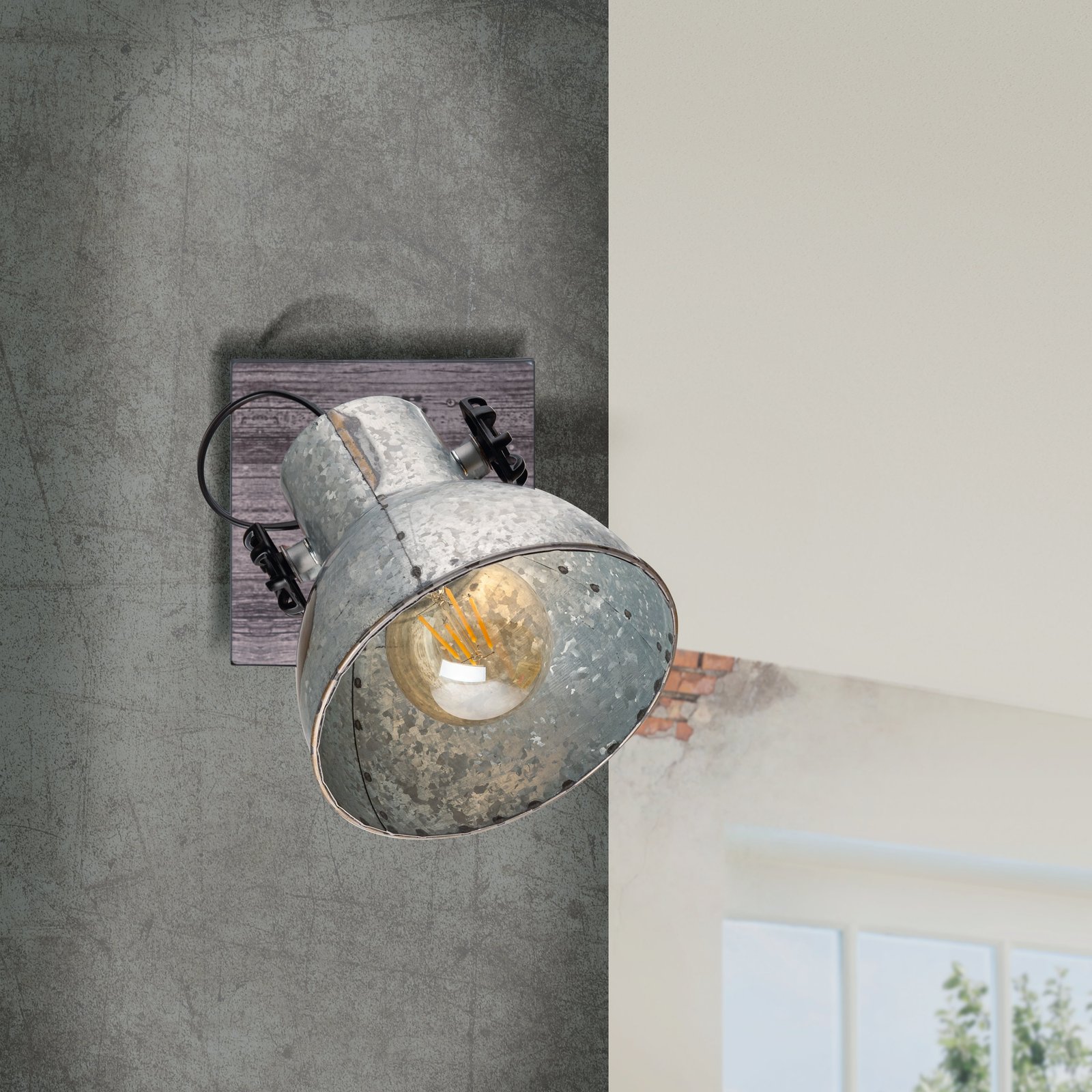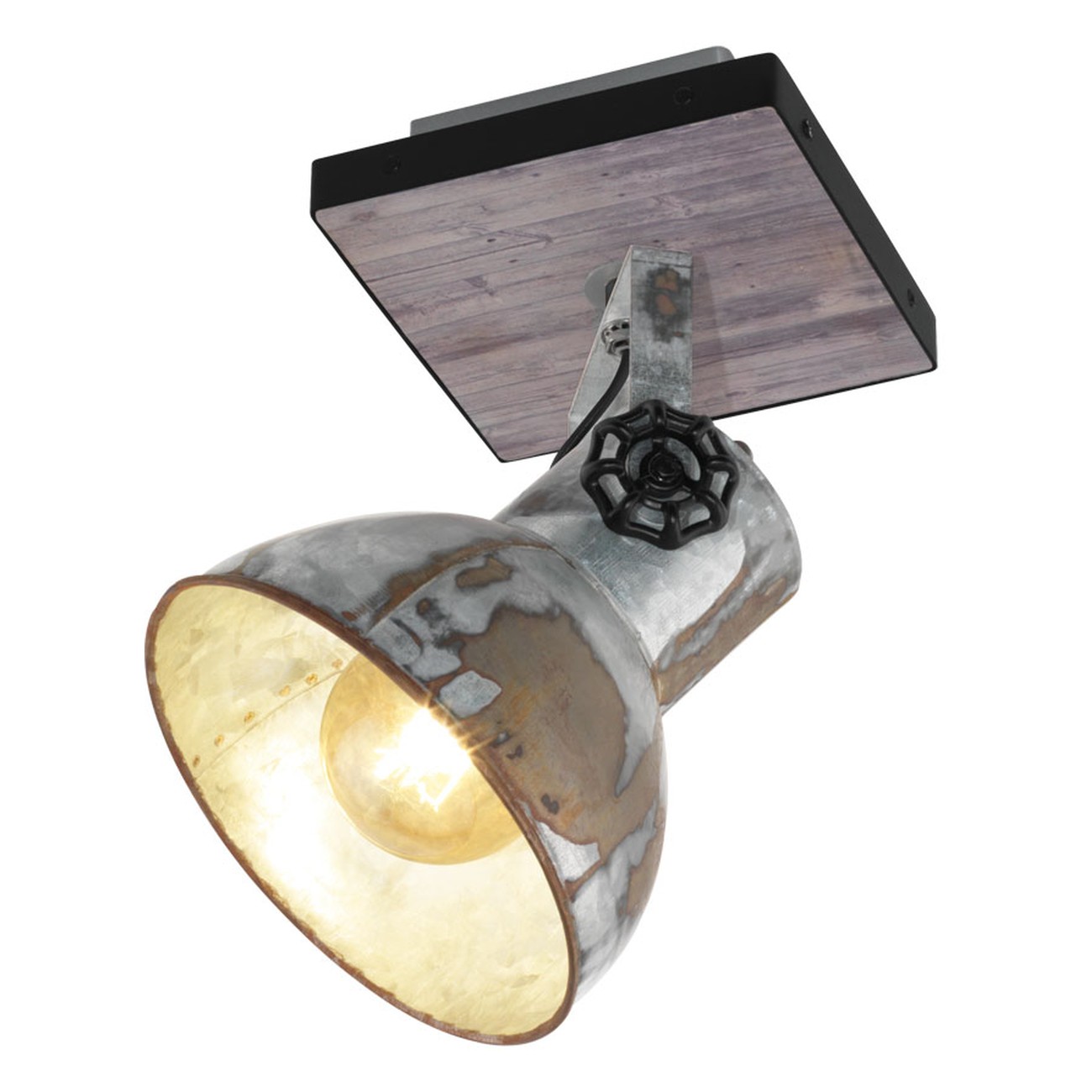 Interessante Strahler aus Stahl und Holz. Die Lampen haben einen sehr ausgeprägten, industriellen Charakter. Der Sockel hat eine braune Farbe und die Lampenschirme sind im Patina-Look von rostigem Zink gehalten. |