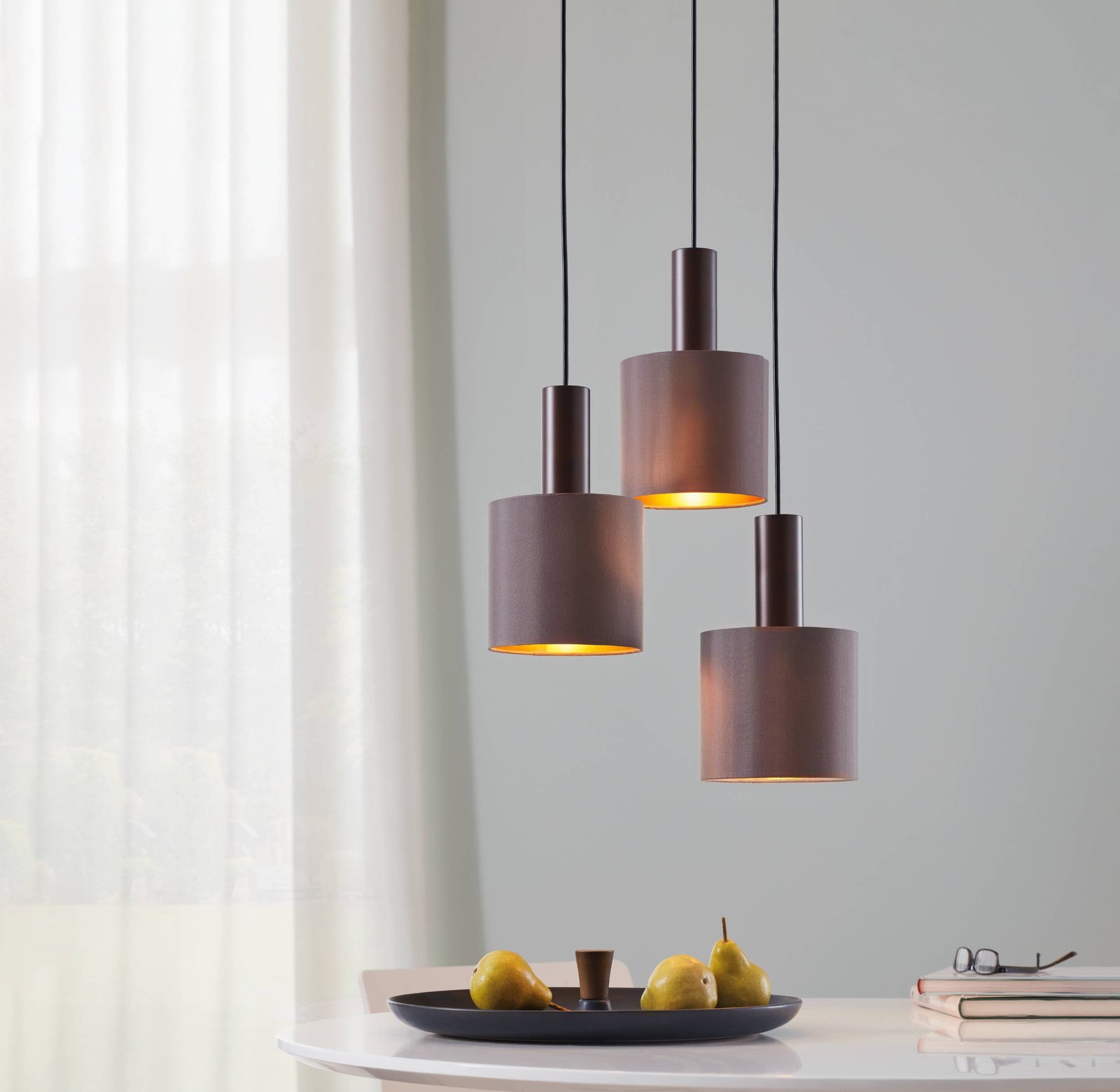 Die modernen Leuchten Concessa 1 bestehen aus dunkelbraunem Stahl und Textil in einer Kombination aus Cappuccino und Gold. Durch die Kombination aller Leuchten aus diesem Set schaffen Sie ein komplettes Interieur. |