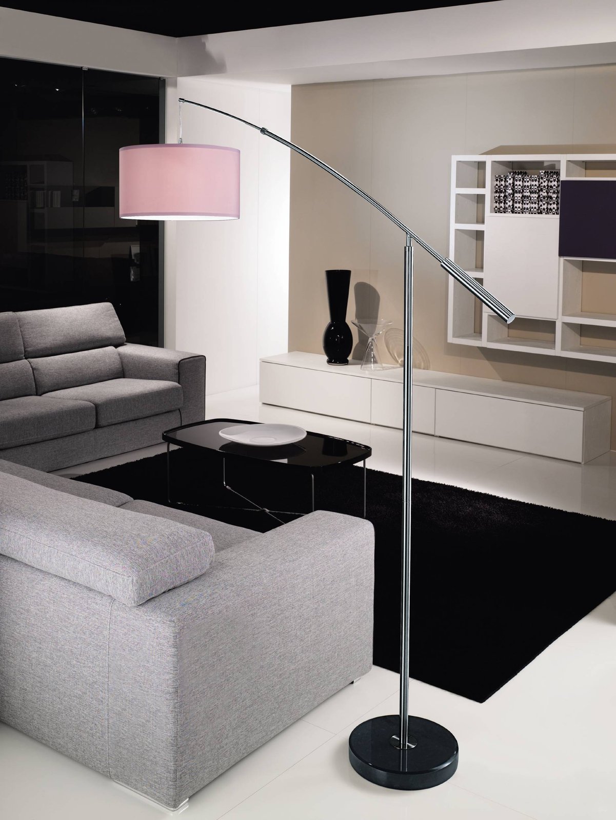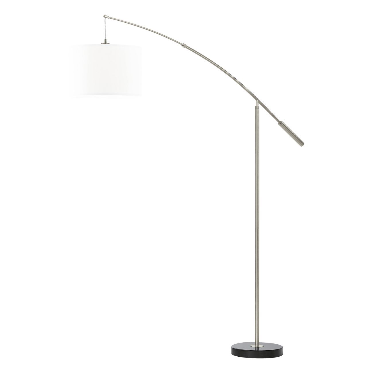 Eine stilvolle und moderne Lampe als interessantes Element für das Wohnzimmer. Es besteht aus mattierter Nickelzelle und weißem Textil. |