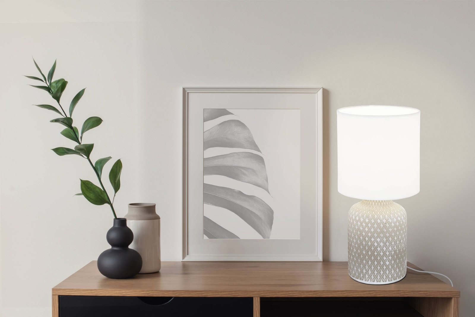 Einfache Lampen aus Keramik und Textilien. Geeignet für eine Kommode im Wohnzimmer oder einen Nachttisch im Schlafzimmer. |