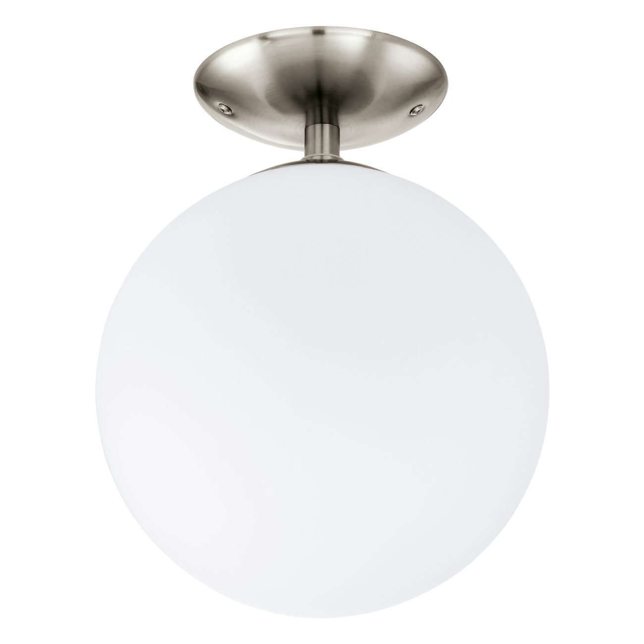 Ein modernes Lampenset aus Stahl in mattem Nickel und Opalglaskugeln in Weiß. |