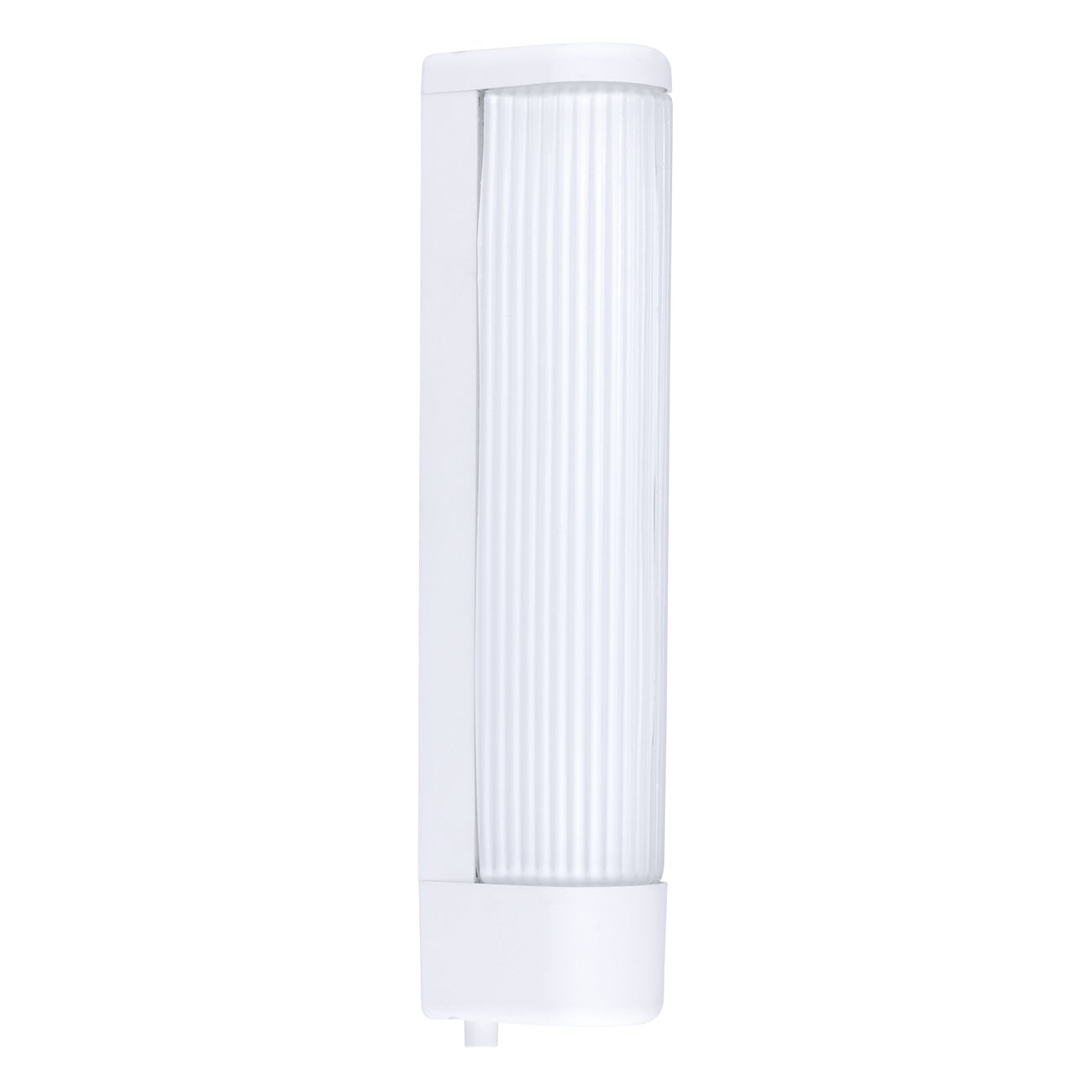 Wandmontierte Badezimmerleuchte aus Kunststoff und Glas in Weiß. Die Lampe verfügt über eine integrierte Steckdose, in die Sie beispielsweise einen Haartrockner oder einen Rasierer bequem anschließen können. Das Licht wird durch den Schalter am Lampenkörper ausgeschaltet. |