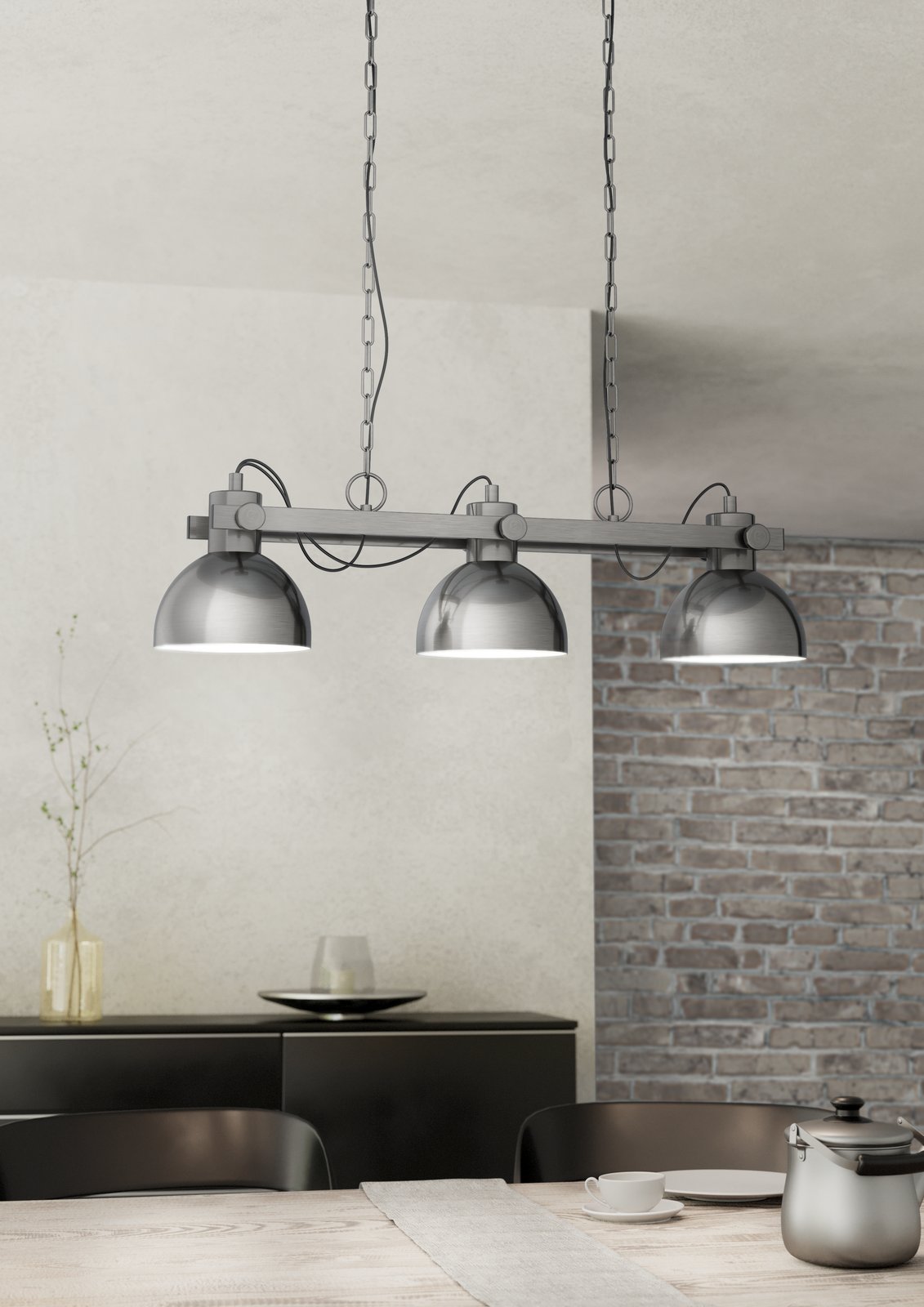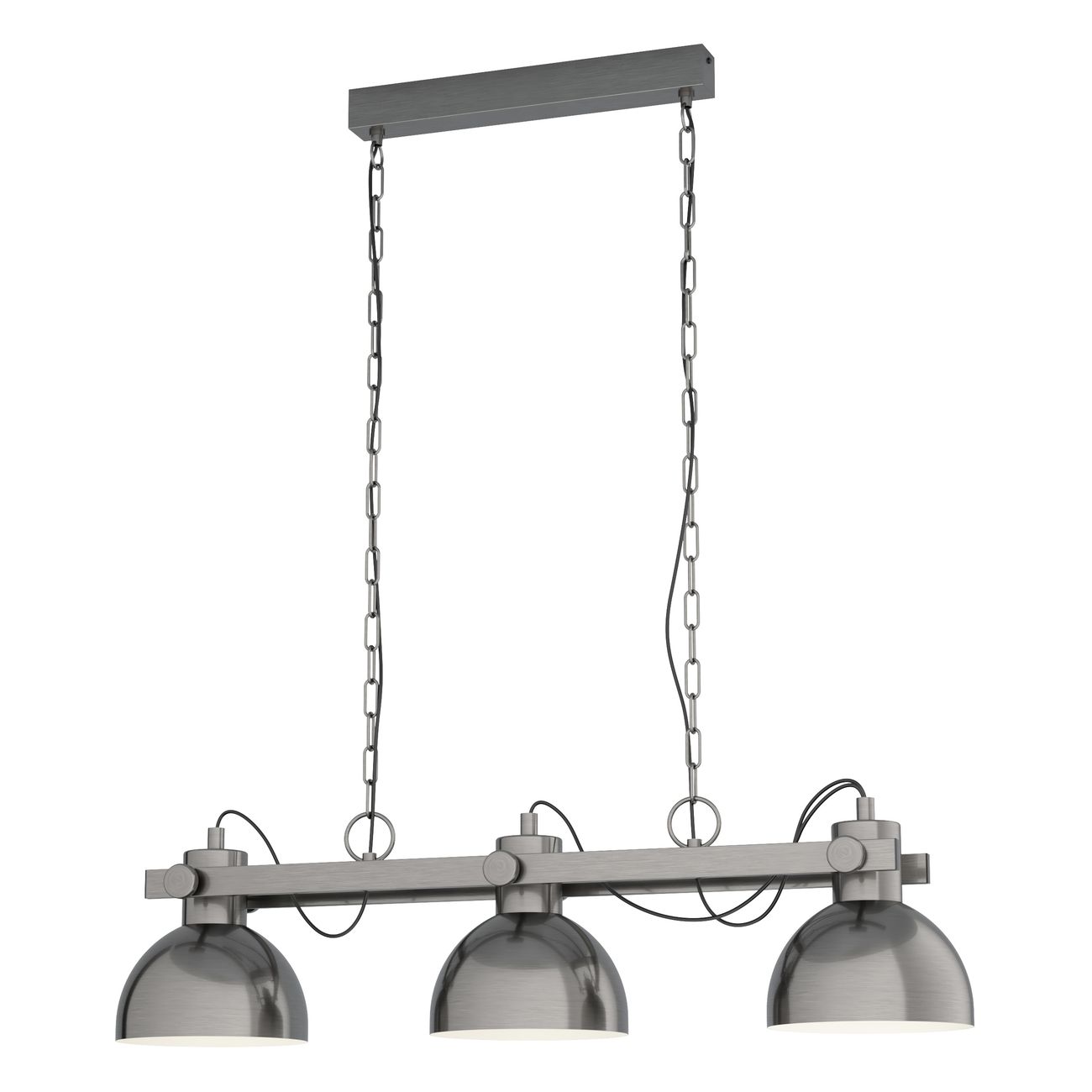 Industrielampe aus Stahl in der Farbe Antik-Nickel und Creme. Dieser dreiflammige Kronleuchter wird über einem Esstisch oder einer Kücheninsel wunderbar zur Geltung kommen. |