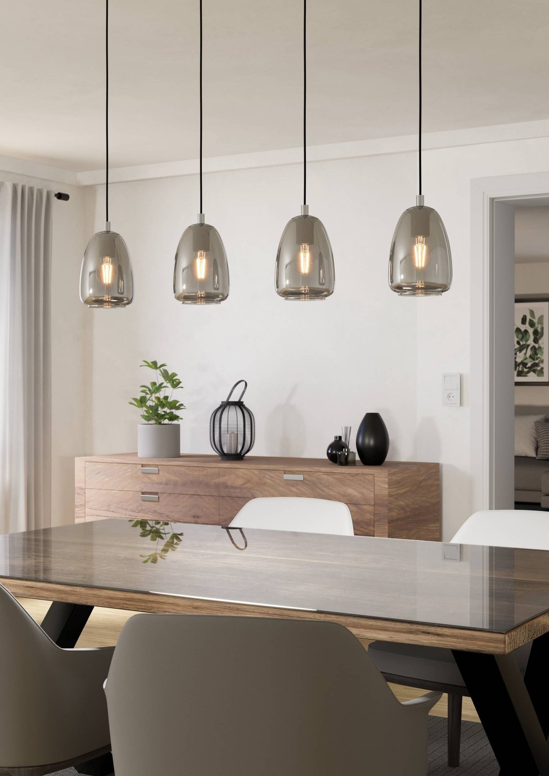 Moderne Kronleuchter aus chromfarbenem Stahl, Lampenschirme aus rauchfarbenem Glas. Sie eignen sich besonders für Küchen und Esszimmer, über dem Esstisch oder der Kücheninsel. |
