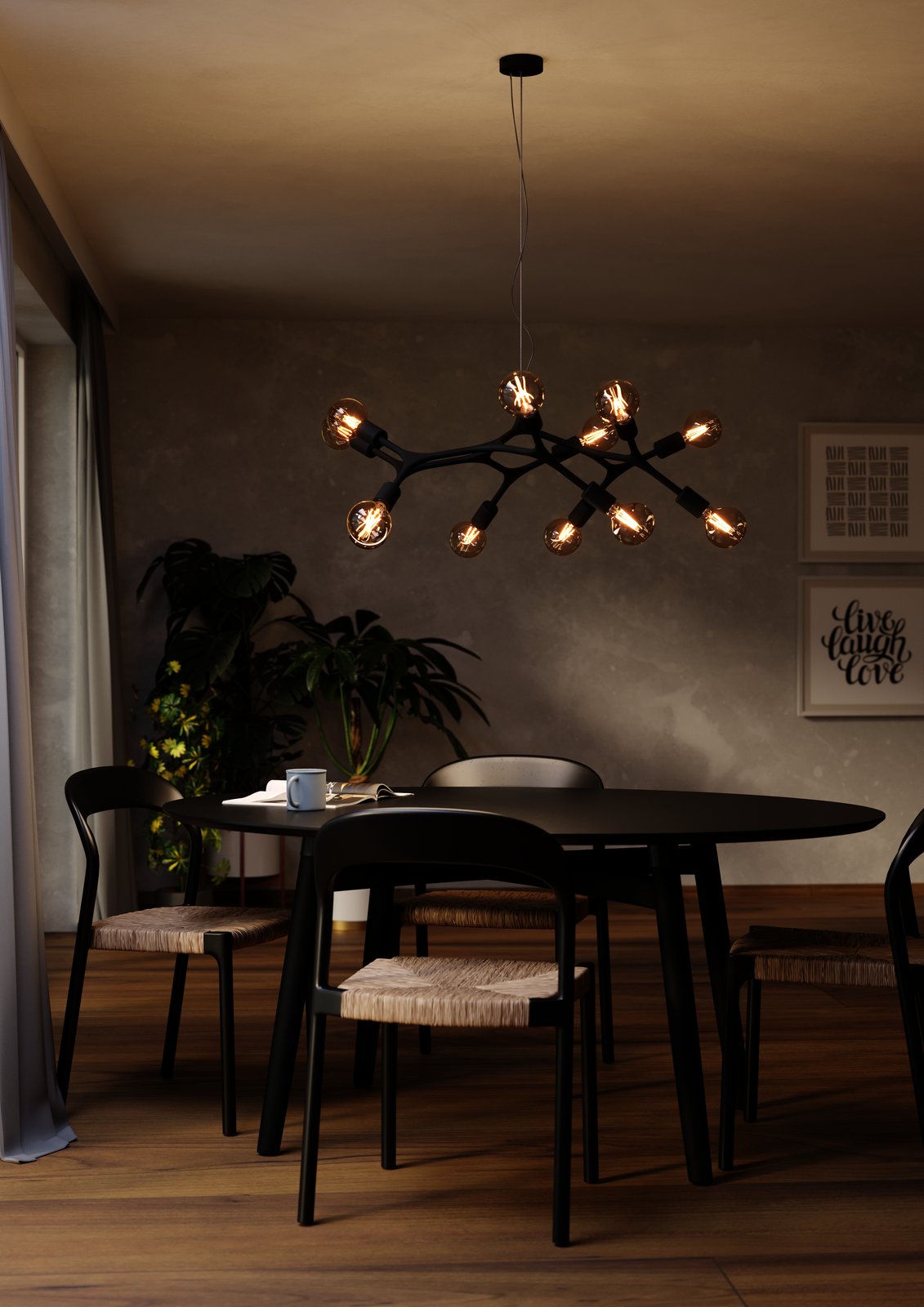 Moderne und stilvolle Kronleuchter aus Stahl in schwarzer Farbe. Ein sehr interessantes Element für Ihr Interieur, insbesondere für Wohnzimmer und Küchen. Sie können mit smarten LED-Leuchtmitteln ausgestattet werden und per Smartphone gedimmt, Farbe und Lichttemperatur verändert werden. |
