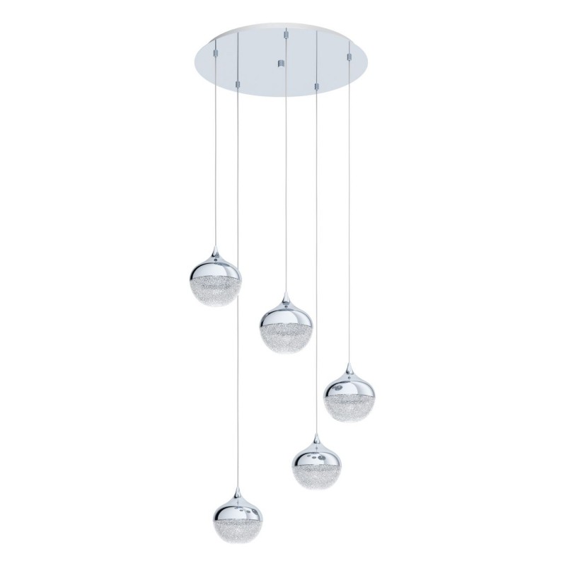 Interessante moderne Kronleuchter, besonders geeignet für Wohnzimmer, Küche und Esszimmer. Der Sockel besteht aus chromfarbenem Stahl und der kugelförmige Lampenschirm aus klarem Kunststoff mit weißen Körnchen, die bei Beleuchtung funkeln und der Lampe einen Hauch von Luxus verleihen. |