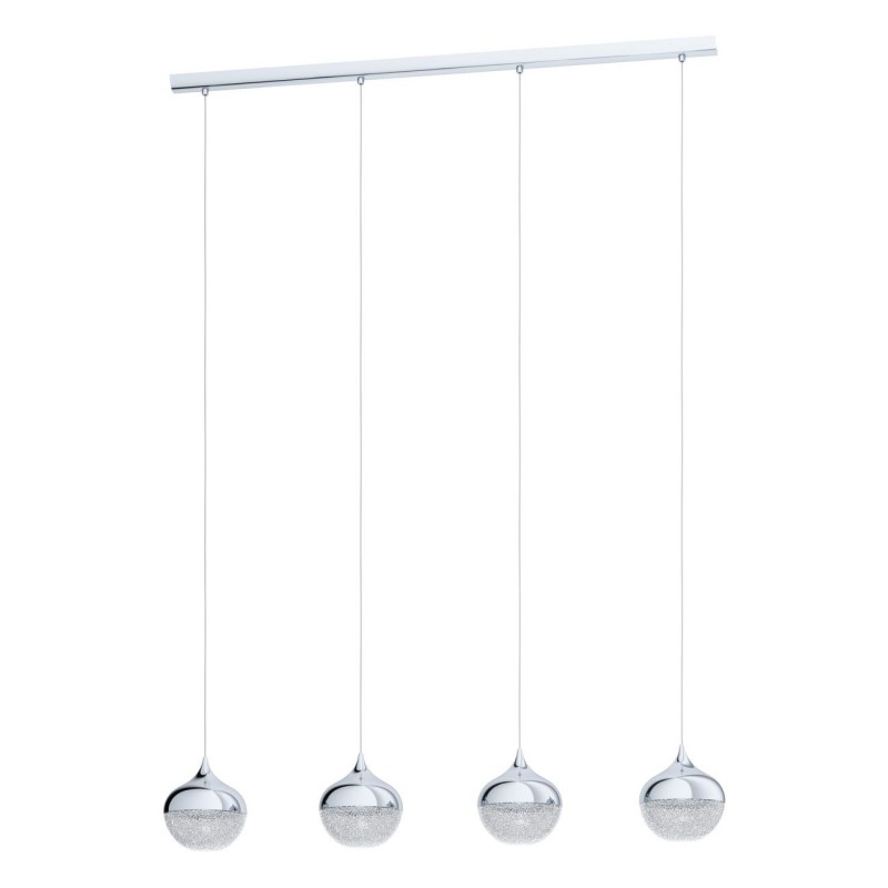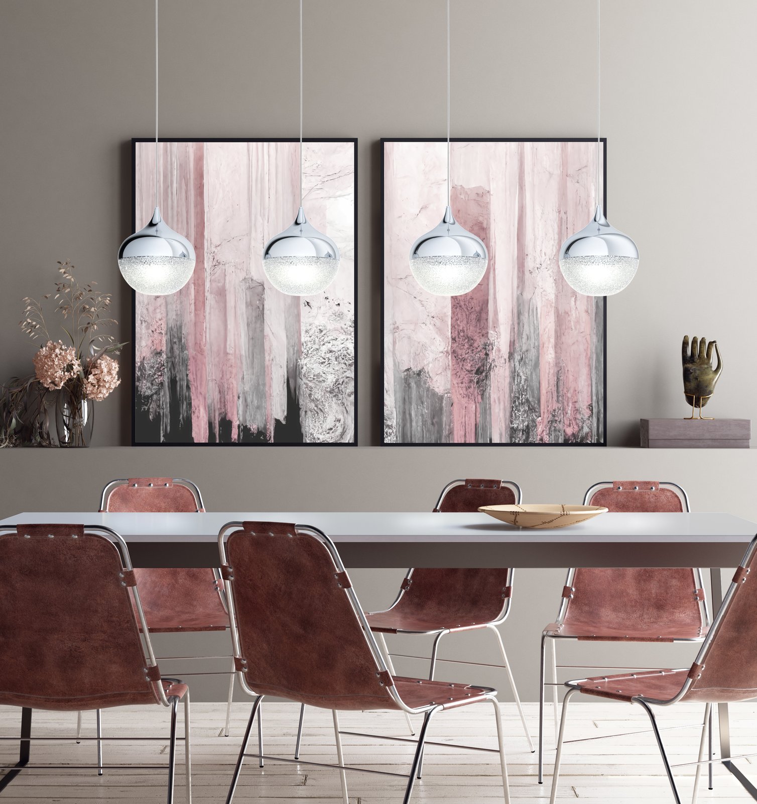 Interessante moderne Kronleuchter, besonders geeignet für Wohnzimmer, Küche und Esszimmer. Der Sockel besteht aus chromfarbenem Stahl und der kugelförmige Lampenschirm aus klarem Kunststoff mit weißen Körnchen, die bei Beleuchtung funkeln und der Lampe einen Hauch von Luxus verleihen. |