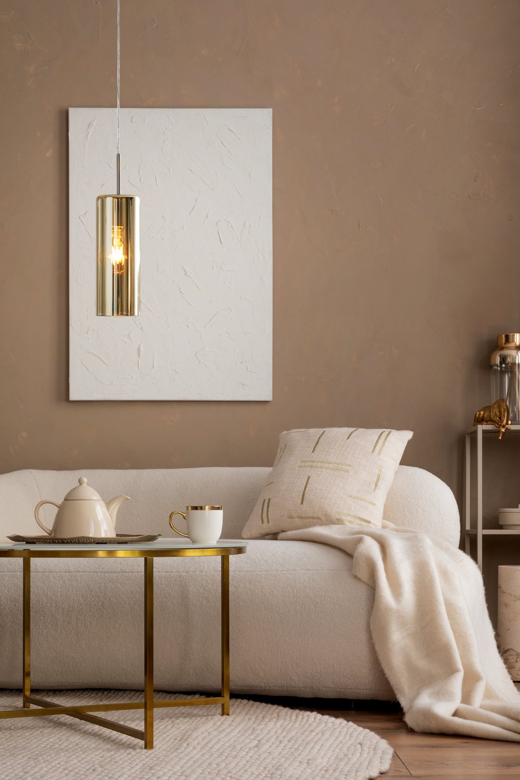 Schlichte, aber moderne Kronleuchter, geeignet für Wohnzimmer oder Küche, über dem Esstisch als interessantes Element. Sie bestehen aus Stahl und einem Glaszylinder. |