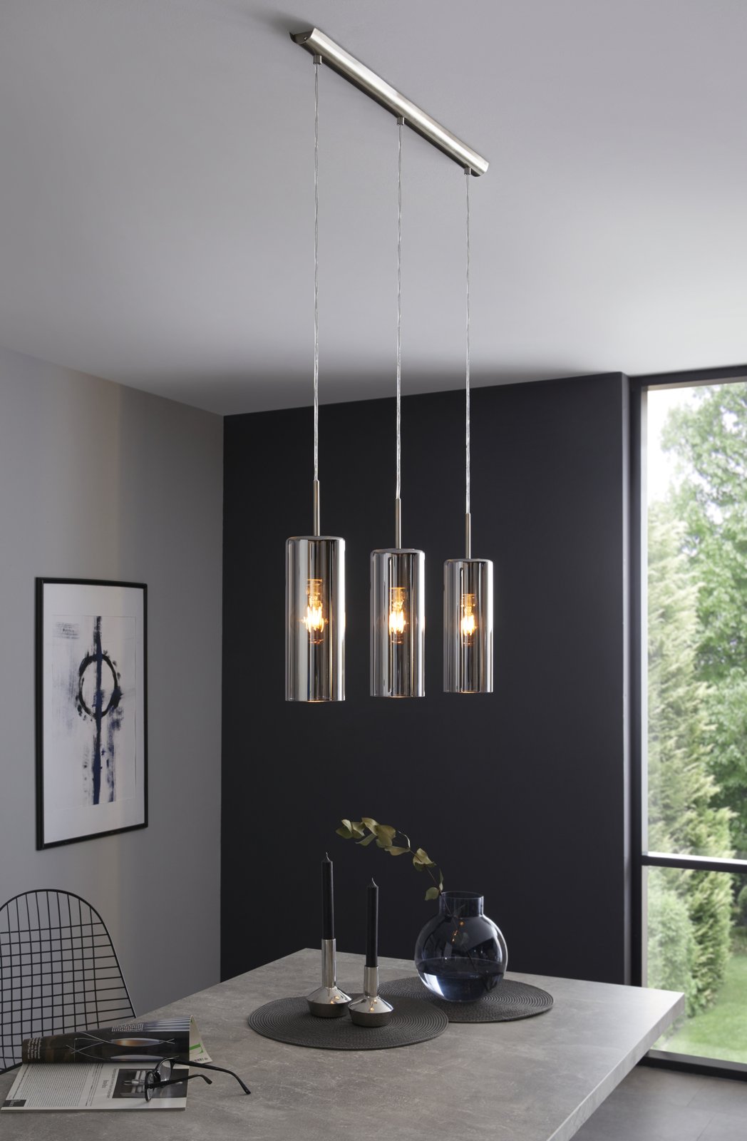 Schlichte, aber moderne Kronleuchter, geeignet für Wohnzimmer oder Küche, über dem Esstisch als interessantes Element. Sie bestehen aus Stahl und einem Glaszylinder. |