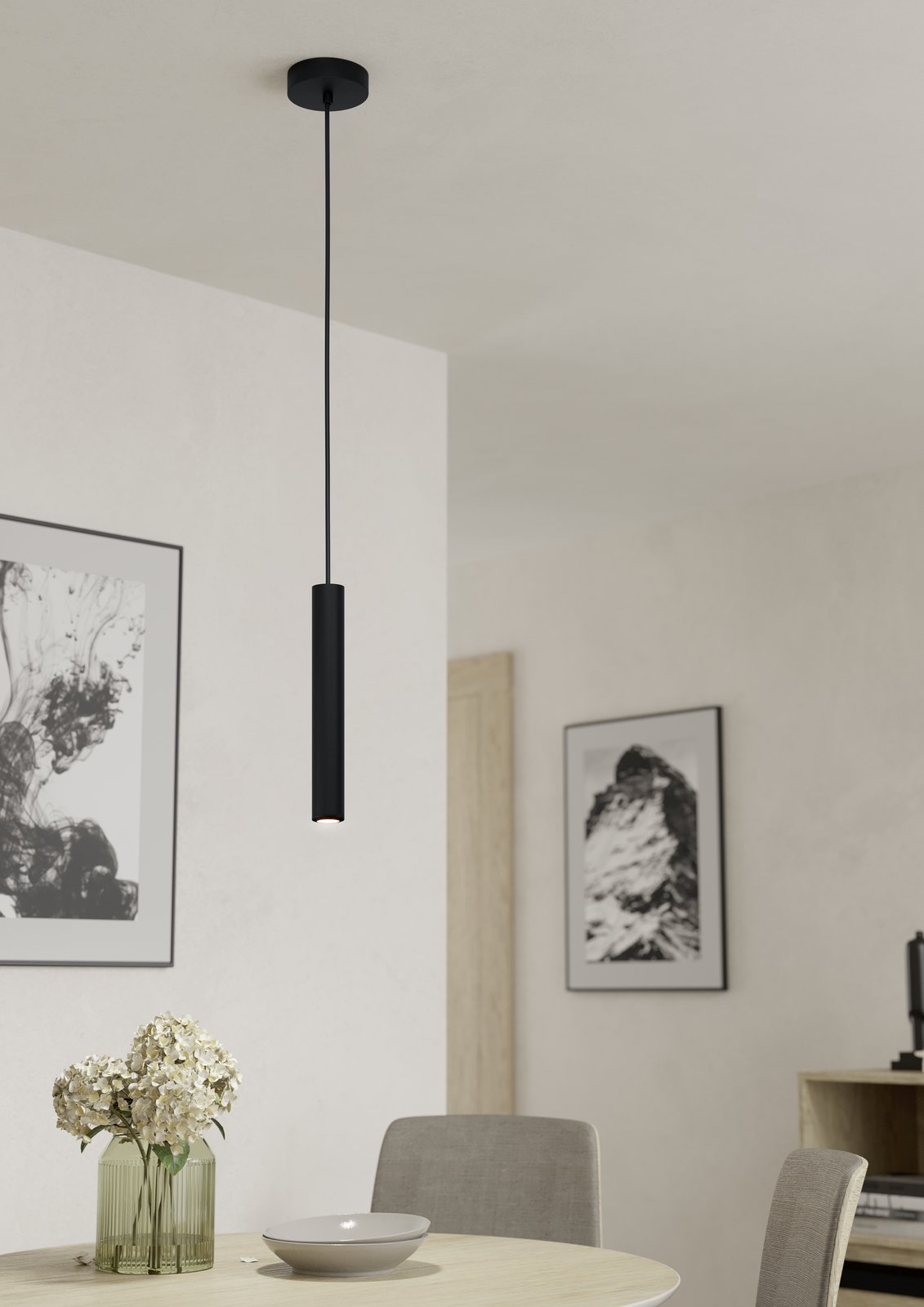 Einfache, aber stilvolle Pendelleuchten, die für alle modernen Innenräume geeignet sind. Sie bestehen aus Stahl in schwarzer Farbe. |